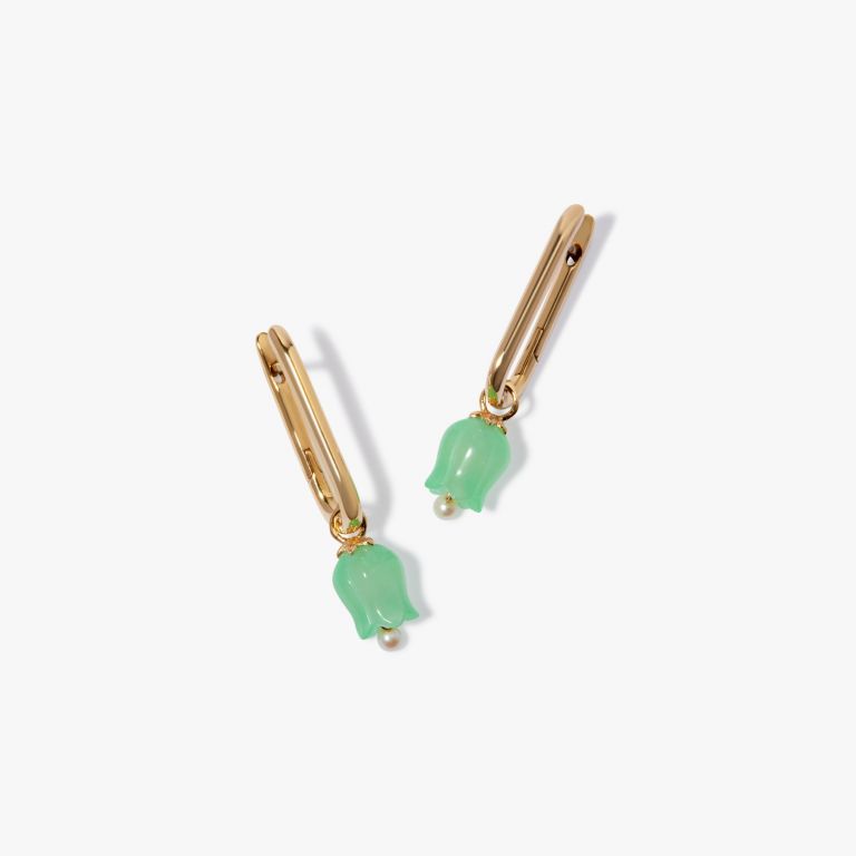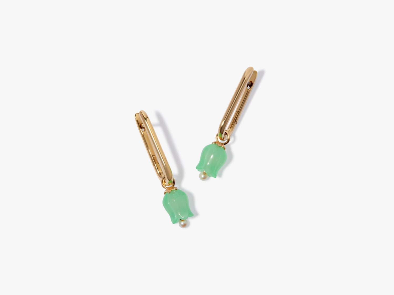These Tulips & Knuckle Earrings by Annoushka offer an elegant expression of love and renewal. Sculpted tulip drops in luminous jade and freshwater pearls hang from 14k yellow gold Knuckle hoops. Each tulip features textured leaves and organic forms that celebrate nature’s elegance. The combination of material and meaning makes them a captivating addition to any ear stack.