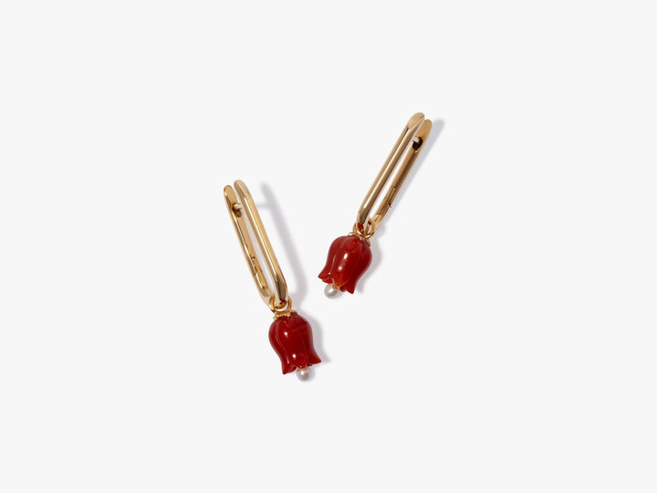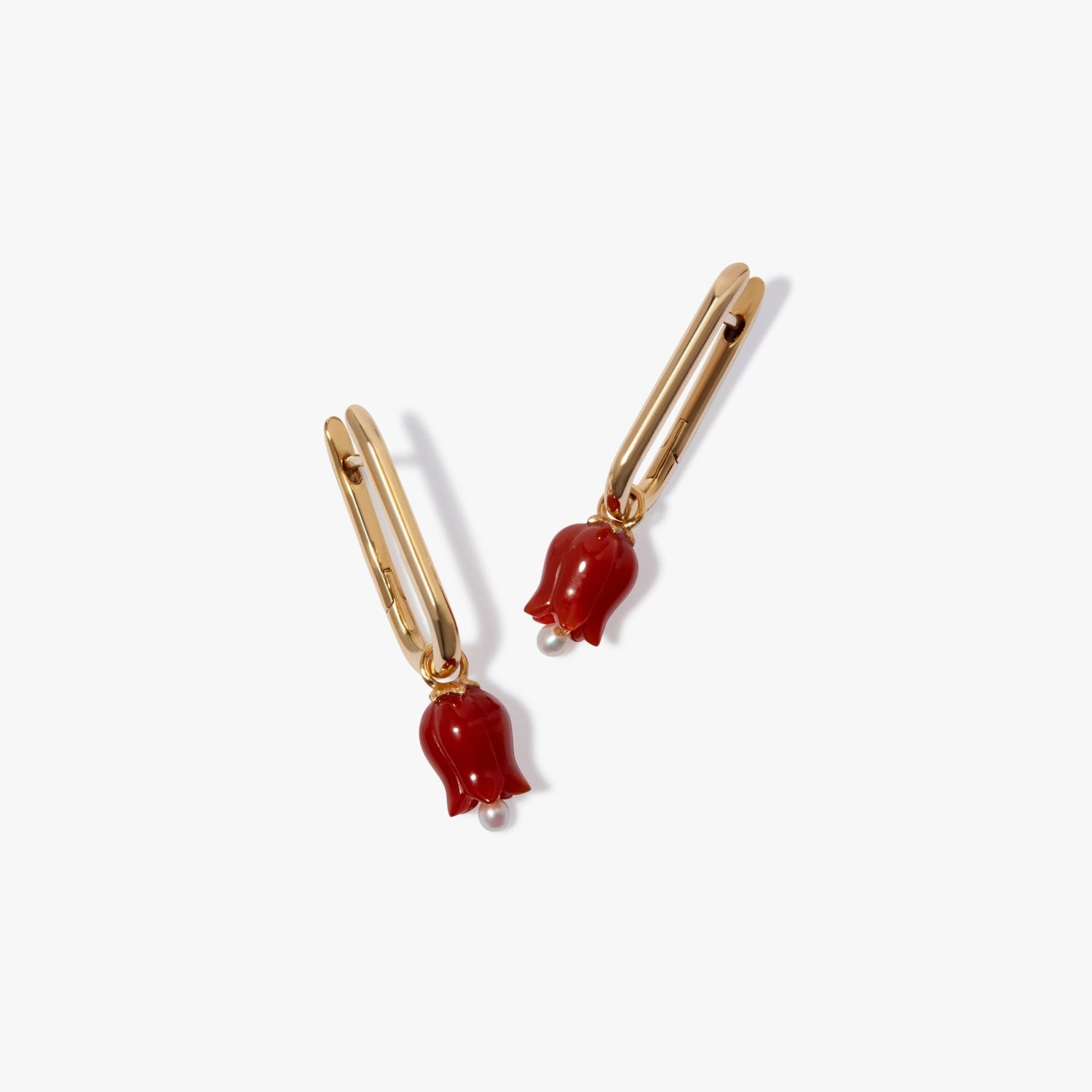 These Tulips & Knuckle Earrings by Annoushka feature delicately sculpted tulip drops in rich agate, paired with freshwater pearls. Suspended from 14k yellow gold Knuckle hoops, the design symbolizes love, prosperity, and growth. This pair offers a joyful statement of renewal with a grounded elegance, making them a standout in the Mix & Match collection.
