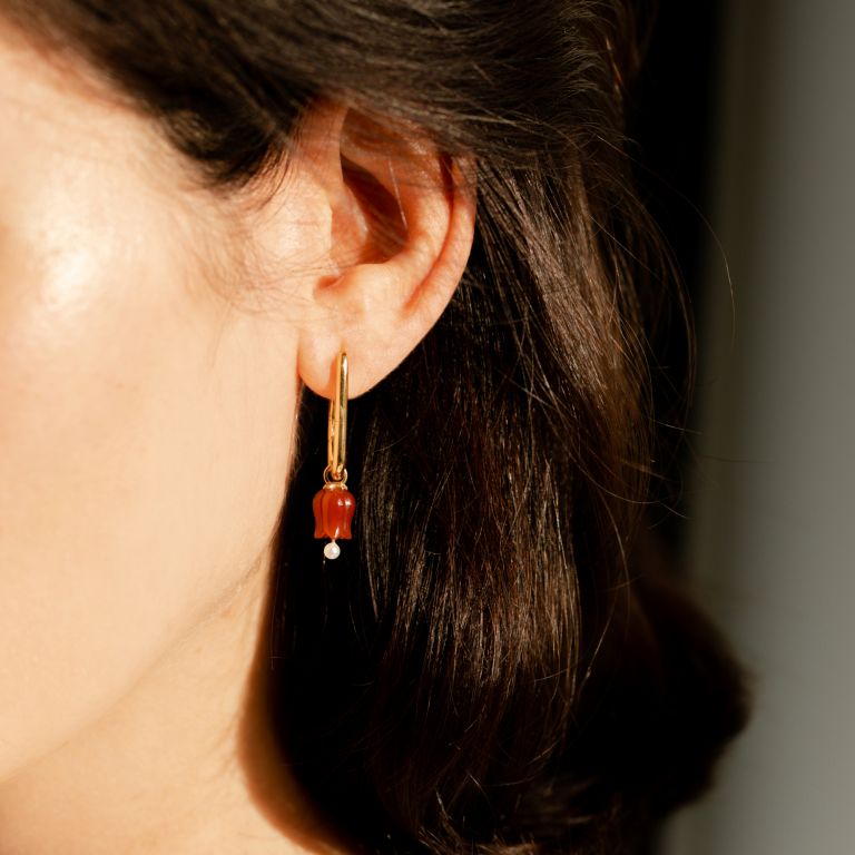 Tulips handcrafted in 18k yellow gold with agate and freshwater pearls. Hoops crafted in 14k yellow gold. Detachable drops.