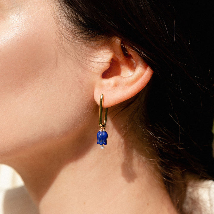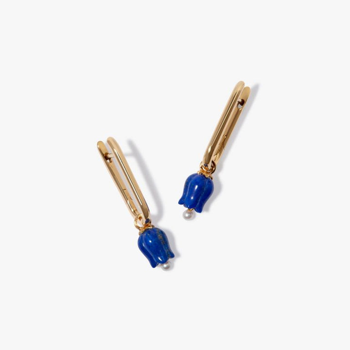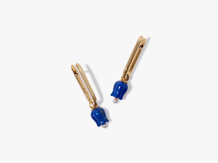 Tulips handcrafted in 18k yellow gold with lapis lazuli and freshwater pearls. Hoops in 14k yellow gold. Detachable design.