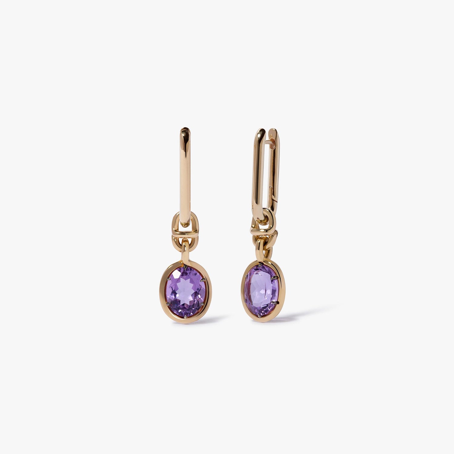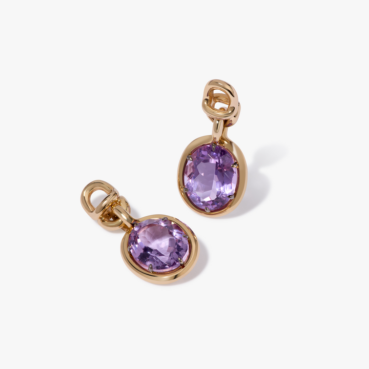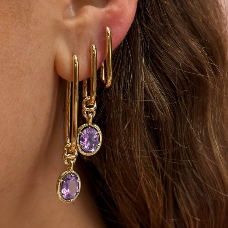 These Knuckle Amethyst Earrings by Annoushka combine sculptural form with vibrant color in a bold, modern style. Featuring golden Knuckle hoops paired with deep purple amethyst drops, the design reflects themes of renewal and creativity. Their modular construction allows for personalized styling, making them an expressive choice within the Mix & Match collection.