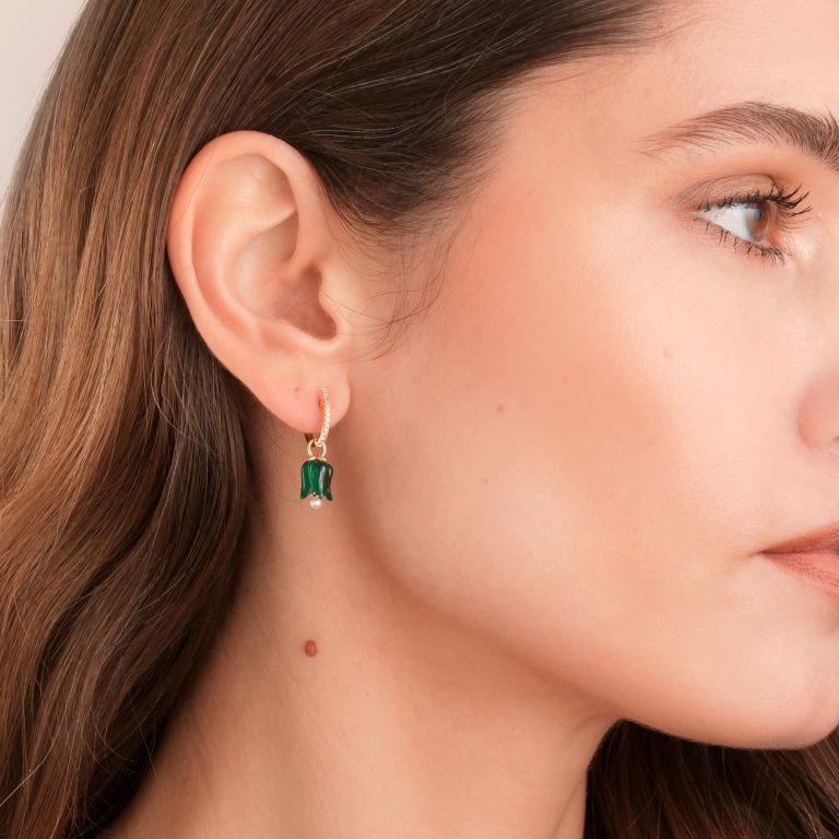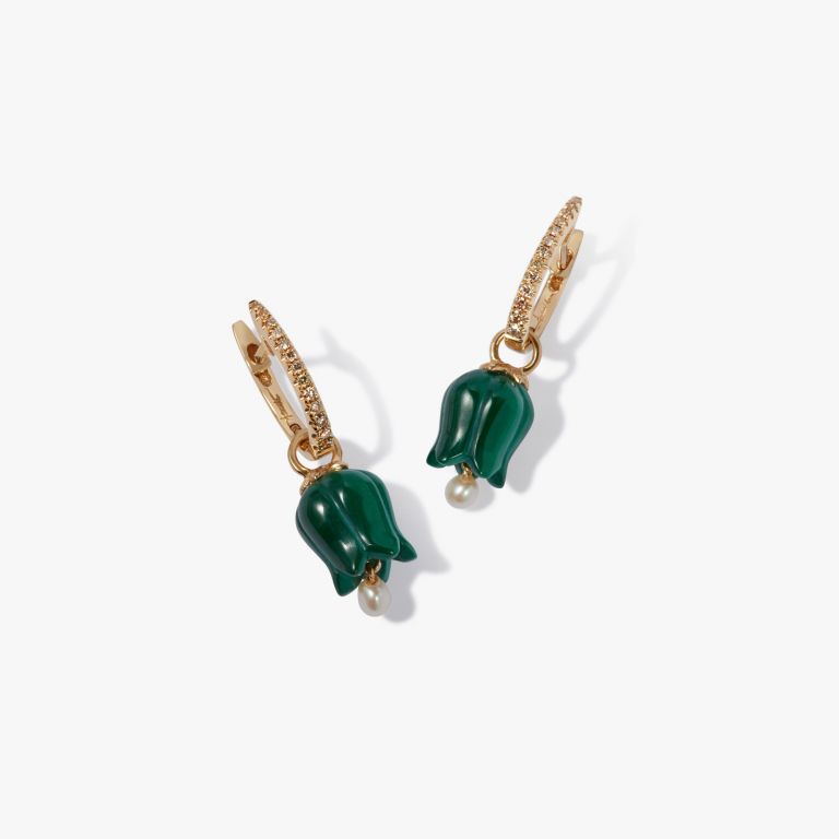 These Tulips Diamond Earrings by Annoushka express blooming love and transformation with a luxurious twist. Malachite tulip drops sway gently from diamond Eclipse Hoops, each accented by delicate pearls. The vibrant green paired with soft shimmer and interchangeable styling invites playful personalization while holding deep symbolic meaning.