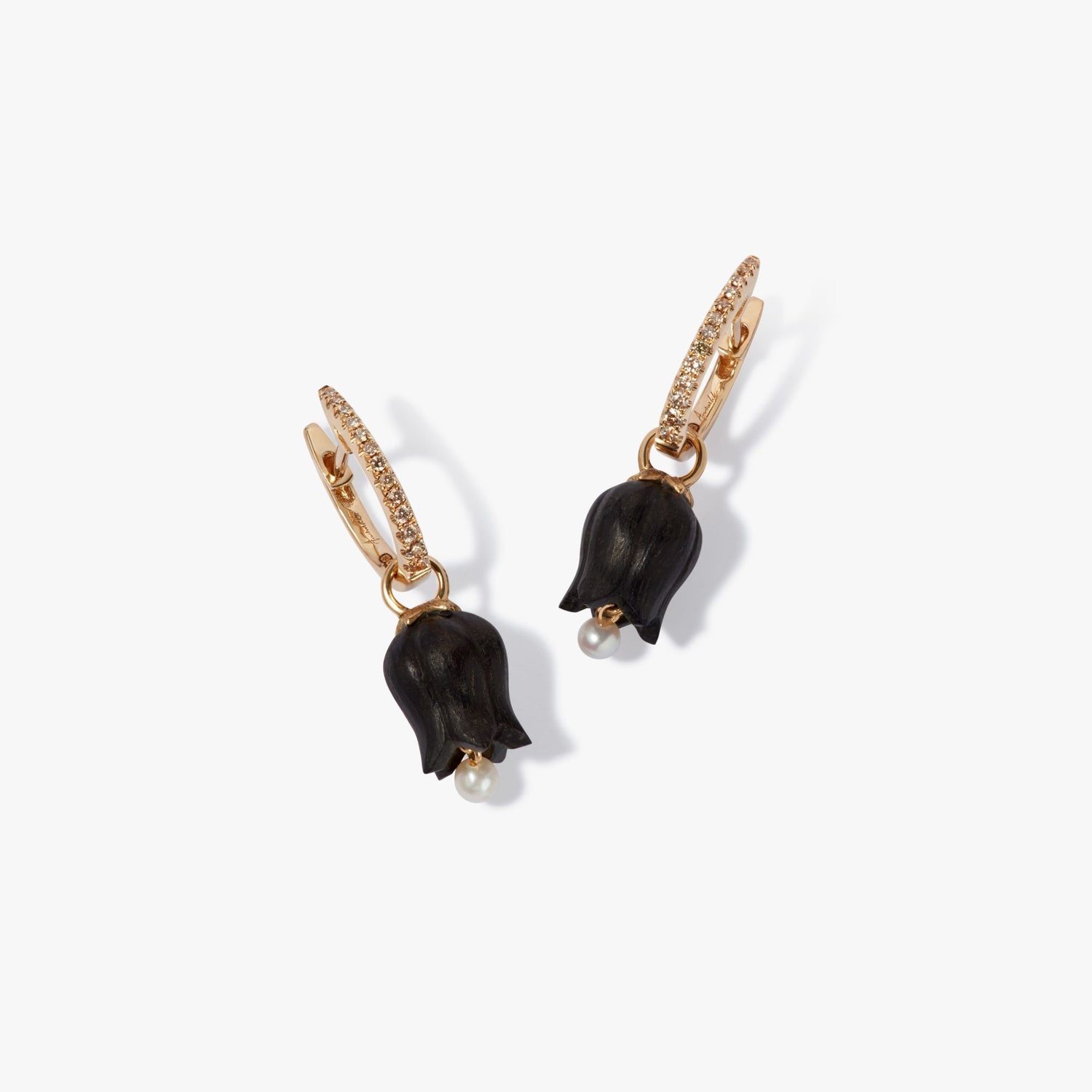 These Tulips Diamond Earrings by Annoushka bloom in deep, rich ebony, symbolising love, prosperity, and new beginnings. The tulip-shaped drops, accented with gently moving pearls, are paired with diamond Eclipse Hoops for a luxurious contrast. With their interchangeable design, these earrings reflect playful personal expression while staying rooted in fine craftsmanship.