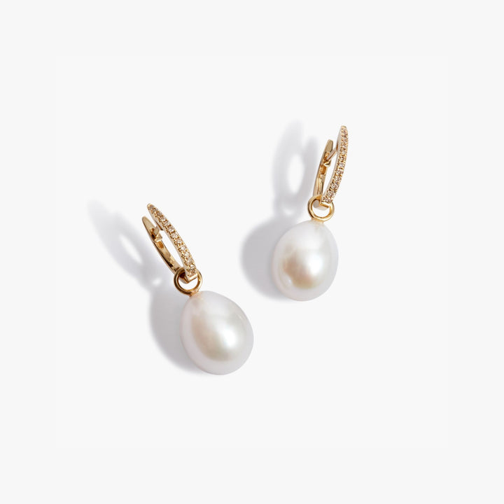 Handcrafted in 18k yellow gold with diamond Eclipse Hoops and detachable pearl drops. Interchangeable design.