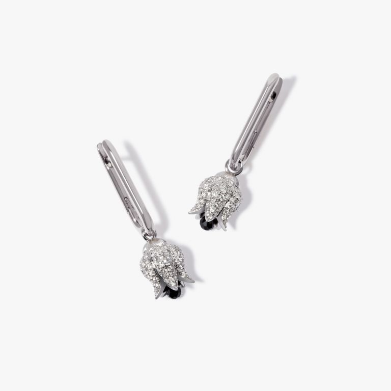 Style Notes: These Tulips Drop Earrings by Annoushka combine delicate craftsmanship with elegant symbolism. Featuring 18k white gold Knuckle hoops paired with detachable diamond tulip drops and black briolette spinel accents, these earrings evoke love, prosperity, and new beginnings. Their textured leaves and sculpted forms add dimensional beauty, perfect for mixing and matching with other styles from the collection.