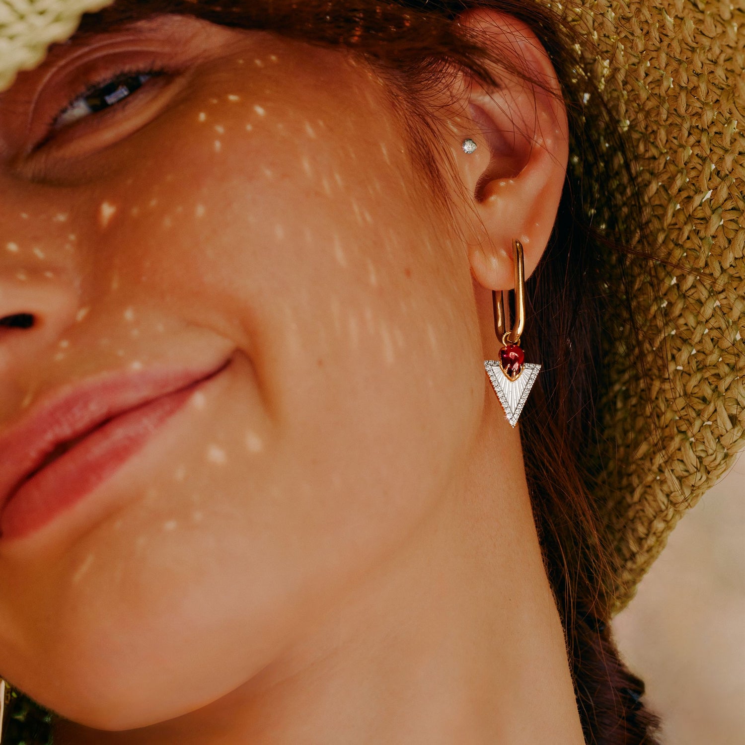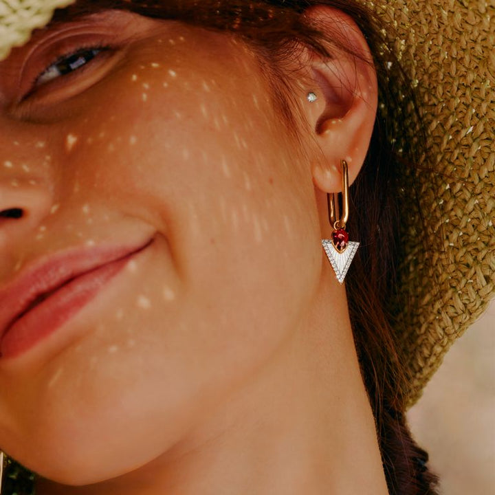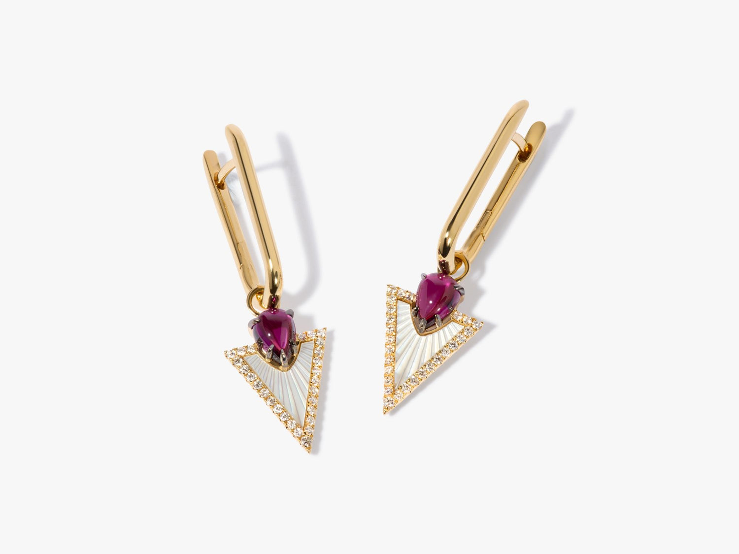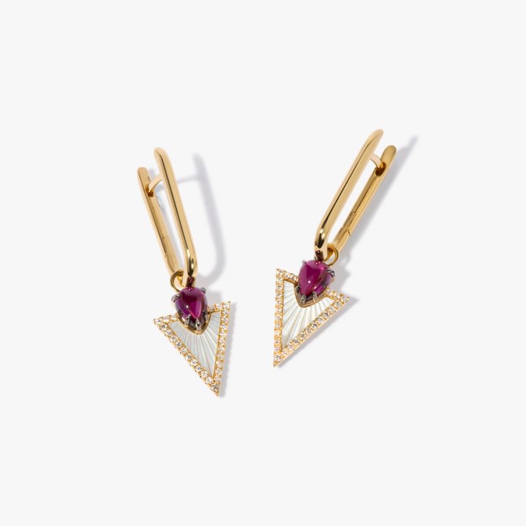 These Flight & Knuckle Earrings by Annoushka blend artisanal craftsmanship with architectural symmetry. Handcrafted in 14k and 18k yellow gold with rhodolite garnets, they combine Knuckle hoops with Kite earring drops featuring mother of pearl framed by diamonds in an Art Deco arrowhead motif. Designed for interchangeable styling with the brand’s earrings range.
