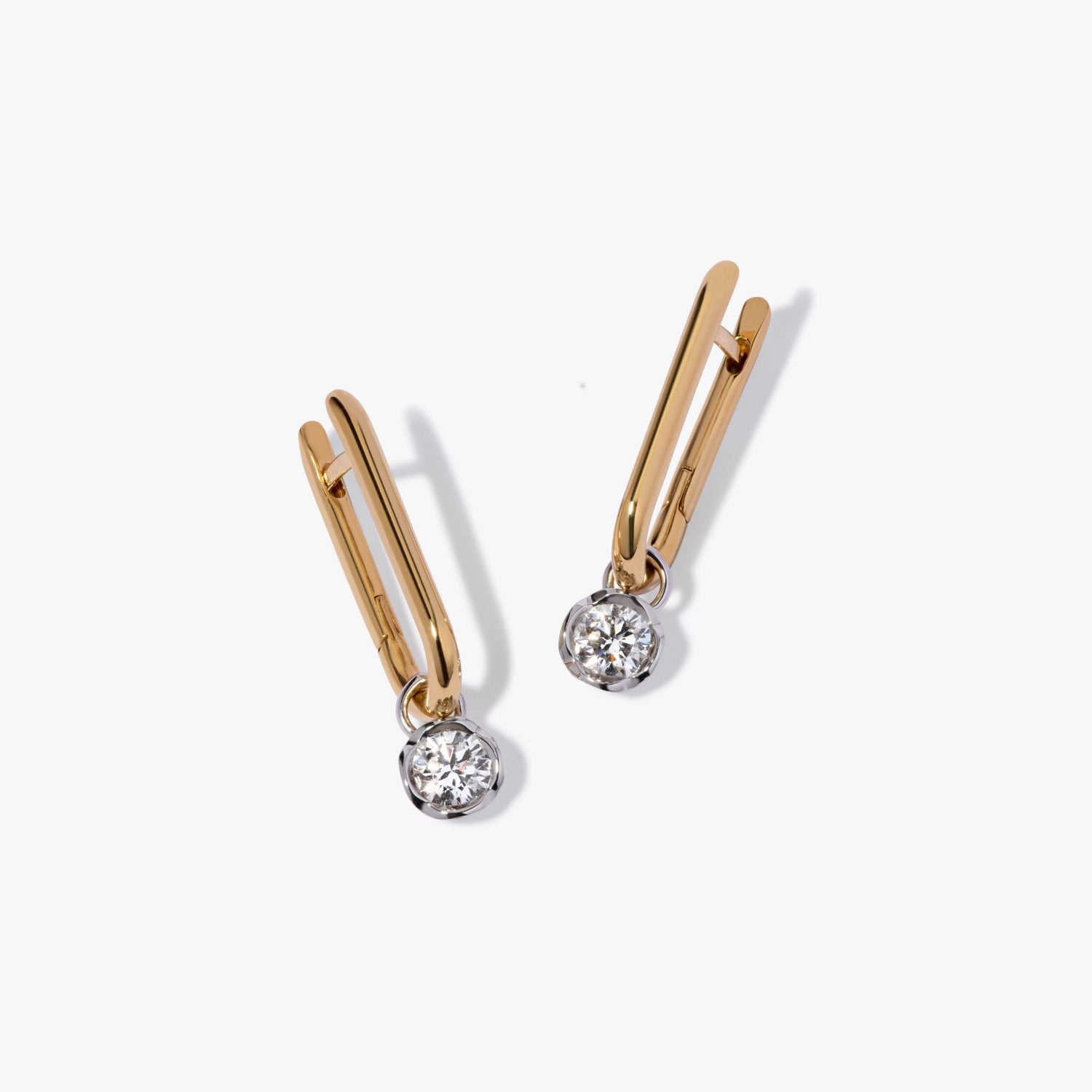 Materials: Handcrafted in 14k yellow gold and 18k white gold with two 0.50ct diamond solitaire drops. Detachable drops with organic cup setting.