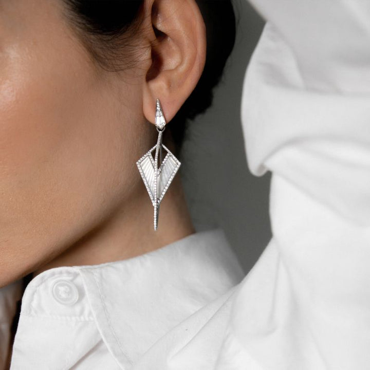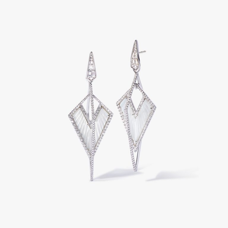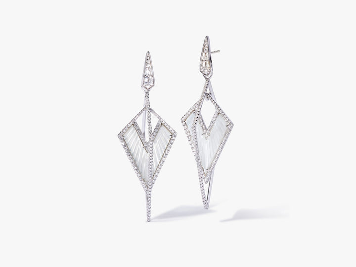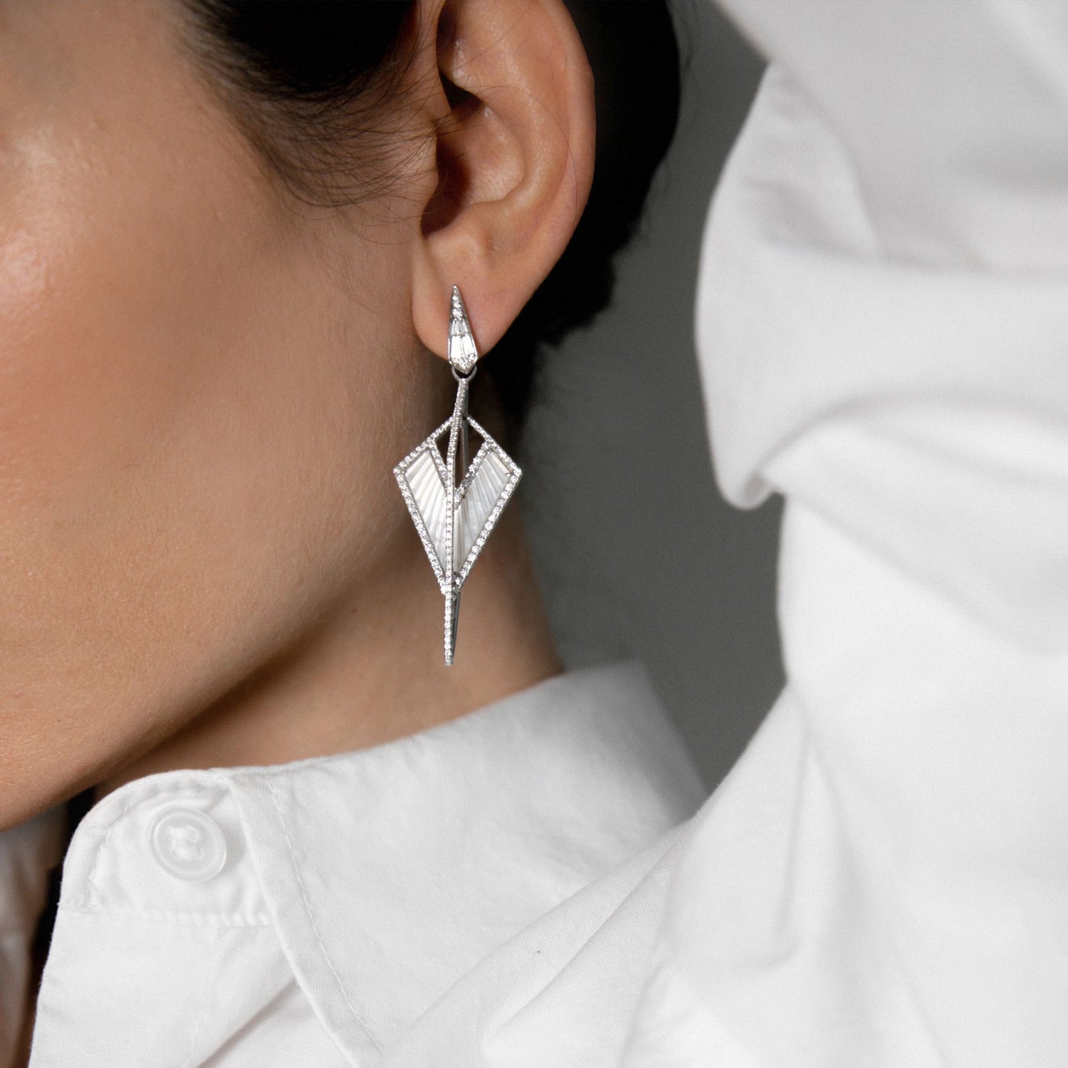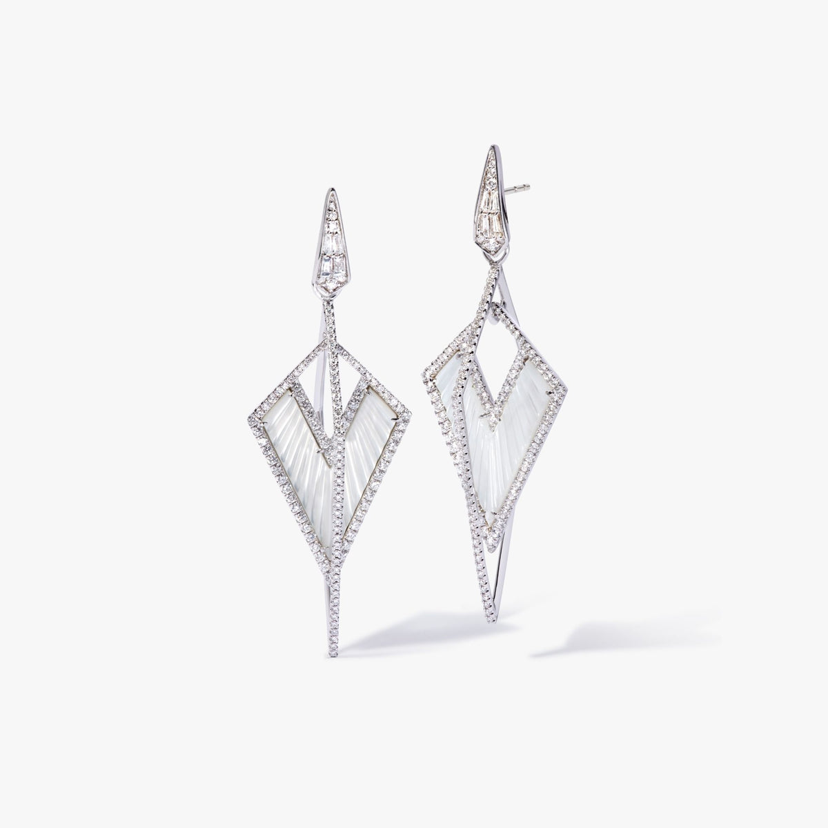 Handcrafted in 18k white gold with carved mother of pearl, diamonds. Limited edition, numbered. Movable 3-D arrowhead design. Post and clasp fittings.