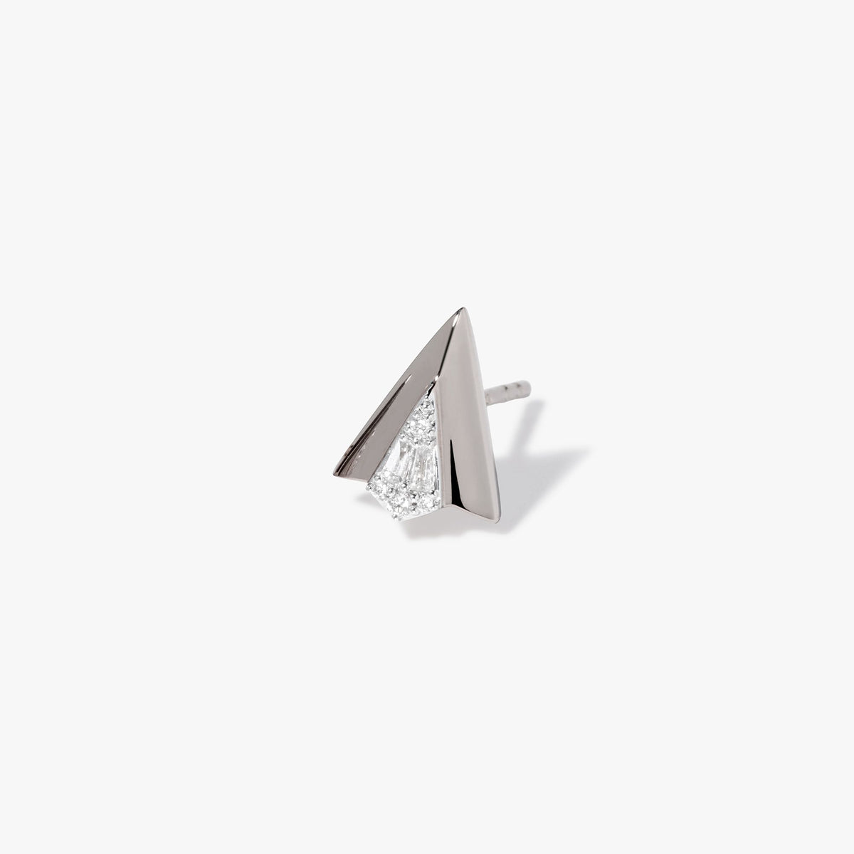 This Flight Arrow Stud Earring by Annoushka symbolizes courage, protection, and peace. Crafted in 18k white gold, it is handset with six diamonds totaling 0.06ct. Designed with a hinged clip to securely attach detachable earring drops, this high polish arrow stud transitions effortlessly from stud to drop. Wear solo or paired; also available in yellow gold. The Flight collection evokes the symmetry and glamour of the Art Deco era.