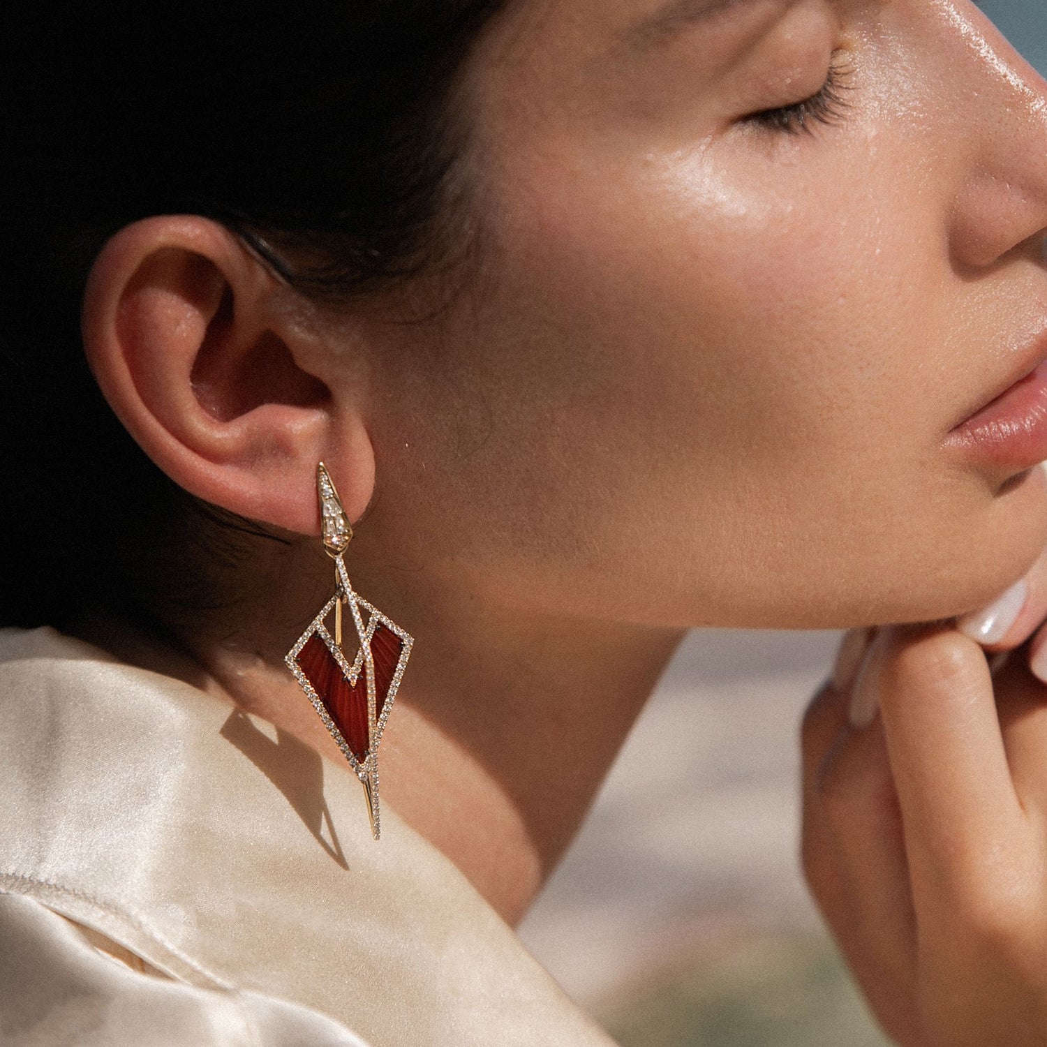 Handcrafted in 18k yellow gold with carved red agate and diamonds. Limited edition, numbered. 3-D arrowhead motif. Post and clasp fittings.