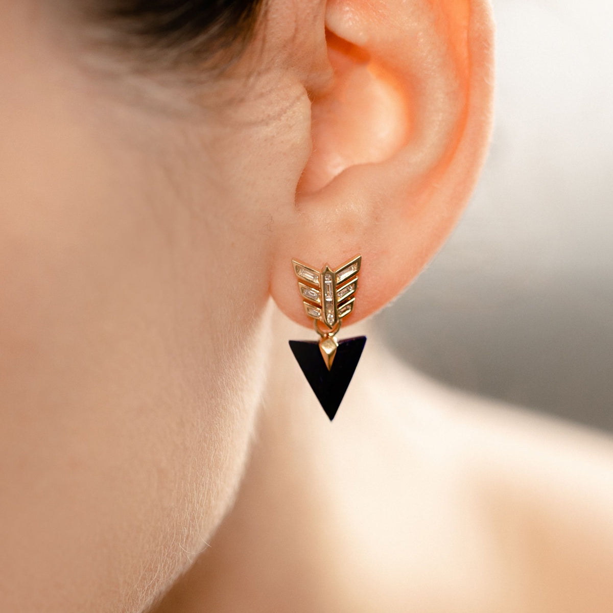 These Flight Arrow Earring Drops by Annoushka are handcrafted in 18k yellow gold with black onyx, embodying geometry and timeless Art Deco elegance. Symbolizing courage, peace, and protection, the 3.06ct onyx sits framed by diamonds within the signature arrowhead motif. These 12.2mm x 10.8mm drops are transformable and pair beautifully with studs or hoops, including the popular Small Hoop Earrings.