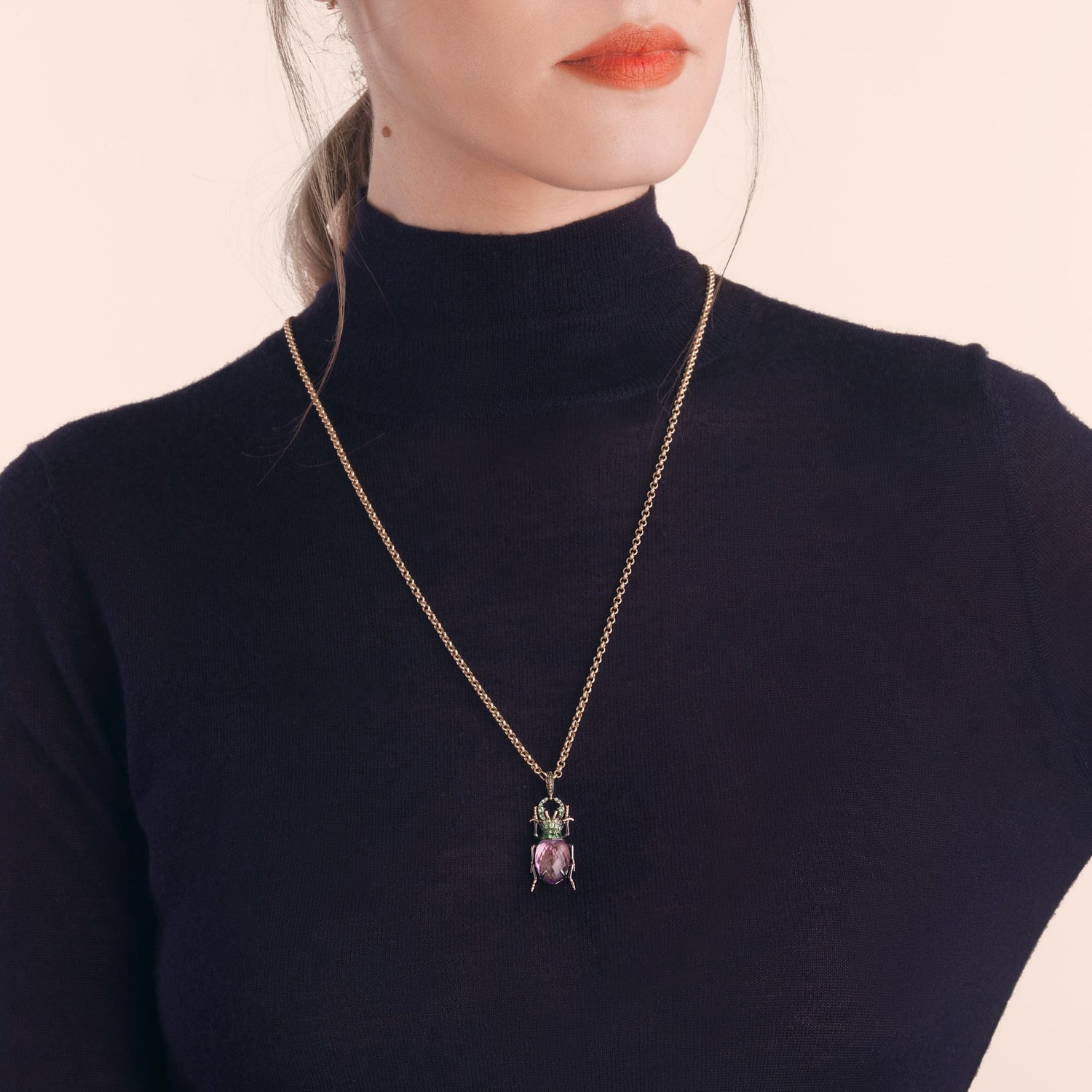 This Beetle Charm Pendant by Annoushka is a bold celebration of transformation and resilience. With a body of glowing amethyst and verdant tsavorite, and eyes of mysterious black diamonds, this talismanic beetle is rich in symbolism and visual impact. Ideal for pairing with a chunky chain for a contemporary yet mythic touch.