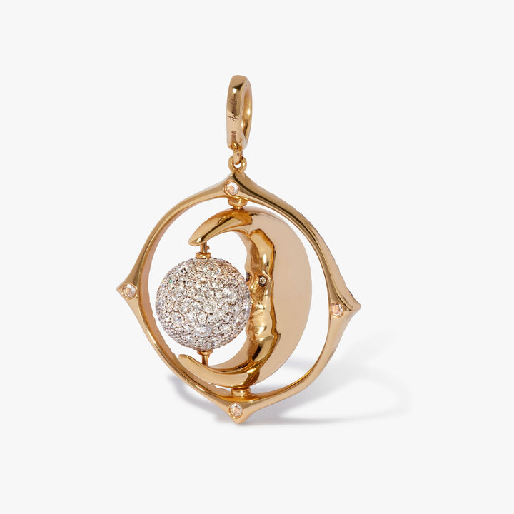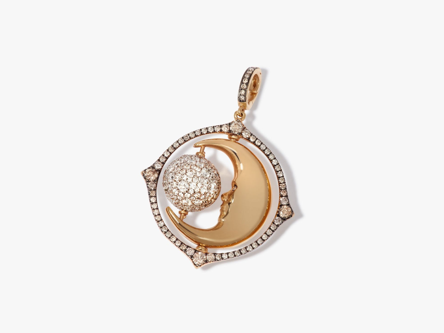 Handcrafted in 18k yellow and white gold with diamonds. Designed with a spinning moon mechanism. Dimensions not specified.