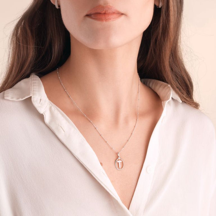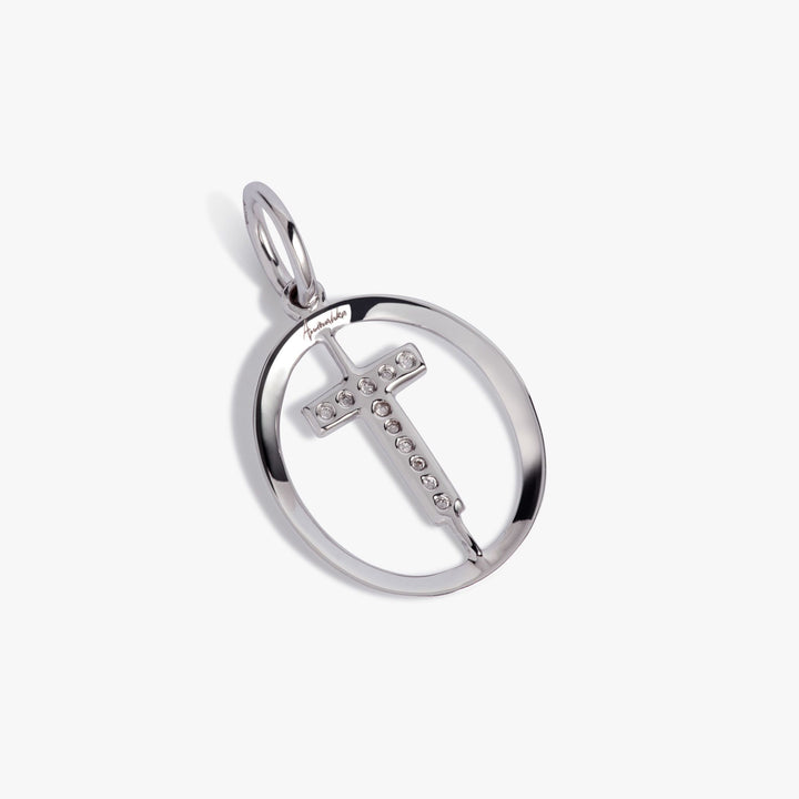 Handcrafted in 18k white gold with reverse-set diamonds. Designed to be paired with a 14k white gold chain. Dimensions not specified.