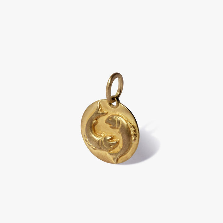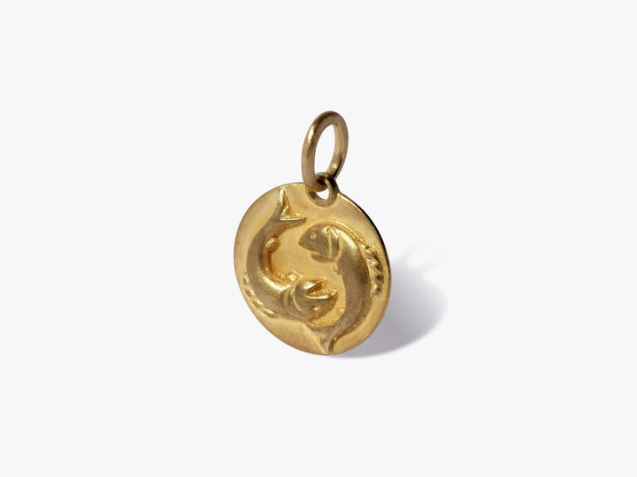 Handcrafted in 18k yellow gold. Features the Pisces symbol; engravable back. Dimensions not specified.