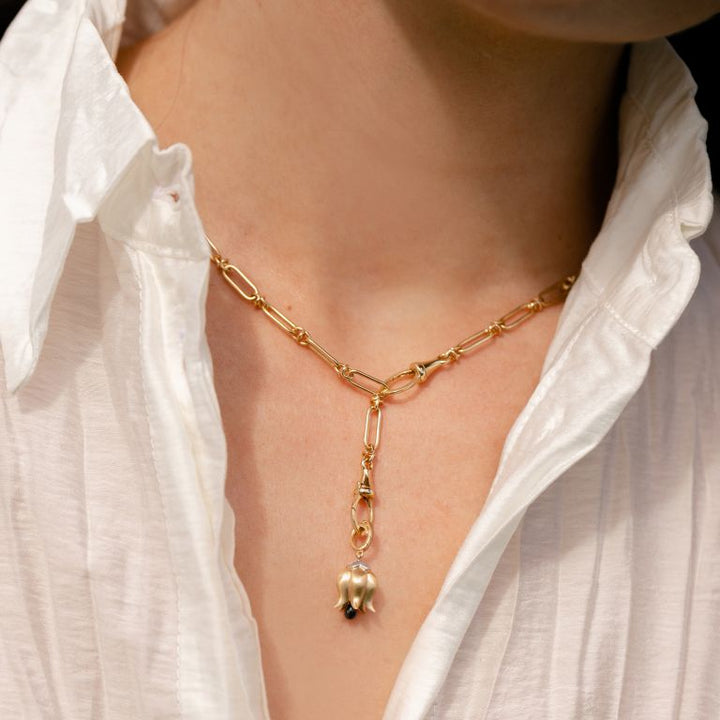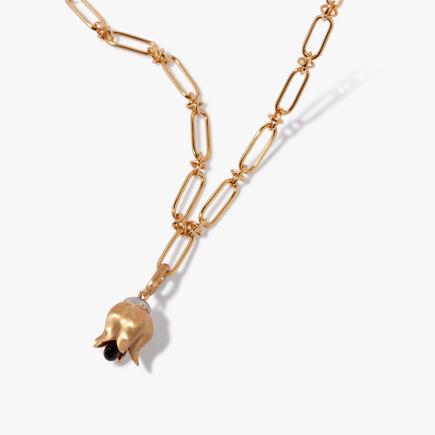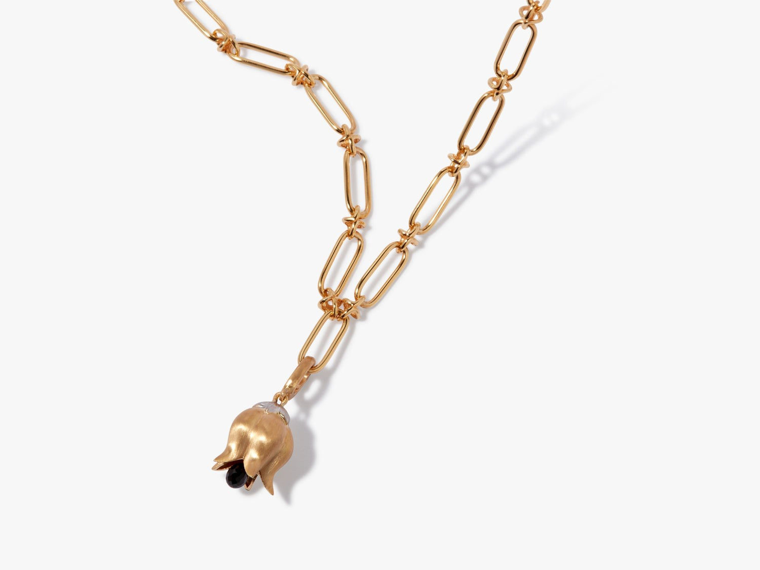 This Tulips & Knuckle Necklace by Annoushka is a poetic pairing of symbolism and strength. The 18k gold tulip charm, complete with a freshwater pearl drop and richly textured leaves, is a tribute to love and new beginnings. Styled with the bold Knuckle Chain in 14k yellow gold, this piece makes a powerful, heartfelt statement.