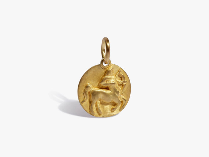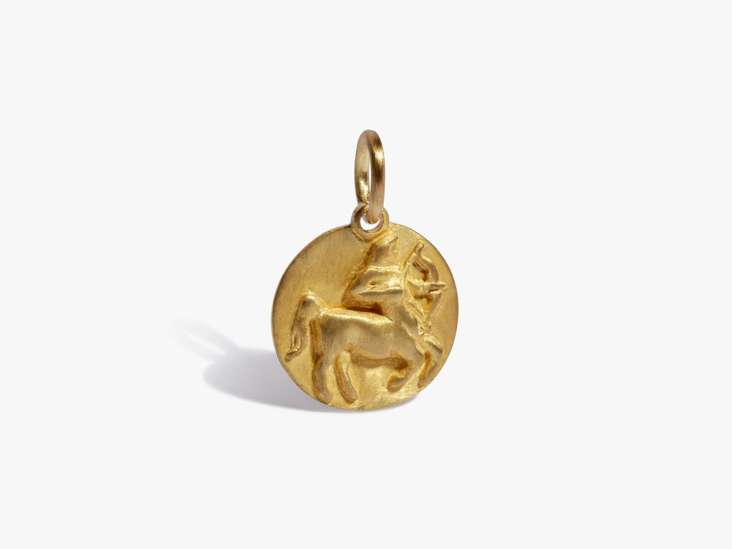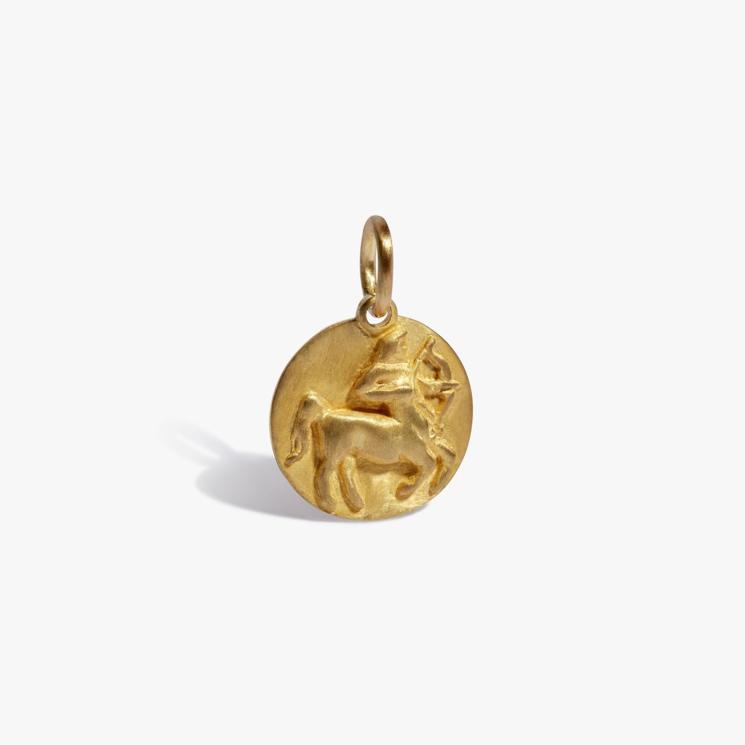 Handcrafted in 18k yellow gold. Features Sagittarius symbol; engravable back. Dimensions not specified.