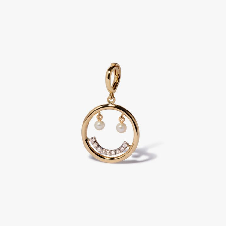 This Happy Charm Pendant by Annoushka is a radiant ode to universal joy. Featuring pearl eyes and a diamond smile, this playful yet refined charm brings happiness to your everyday style. The design is reversible—one side with a joyful face, the other with a smooth polished finish—offering a fun, sentimental twist.