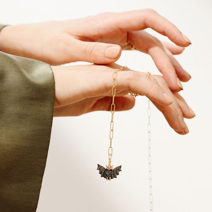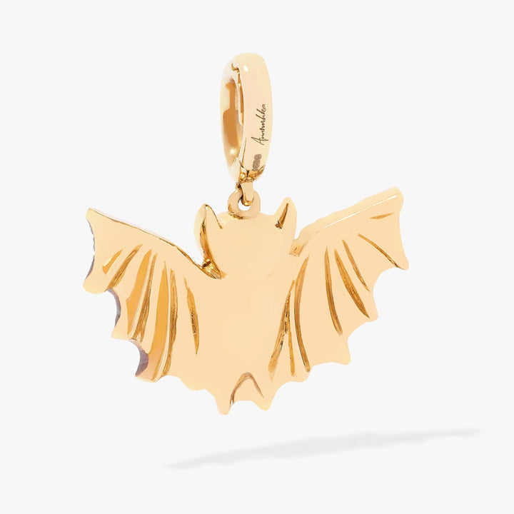 This Mythology Bat Charm Pendant by Annoushka, named Buffy, is a powerful nocturnal talisman. With outstretched wings, ruby eyes, and sparkling black diamonds, this intricately detailed charm represents rebirth and courage in the face of darkness. The polished back can be engraved for a touch of personal magic.