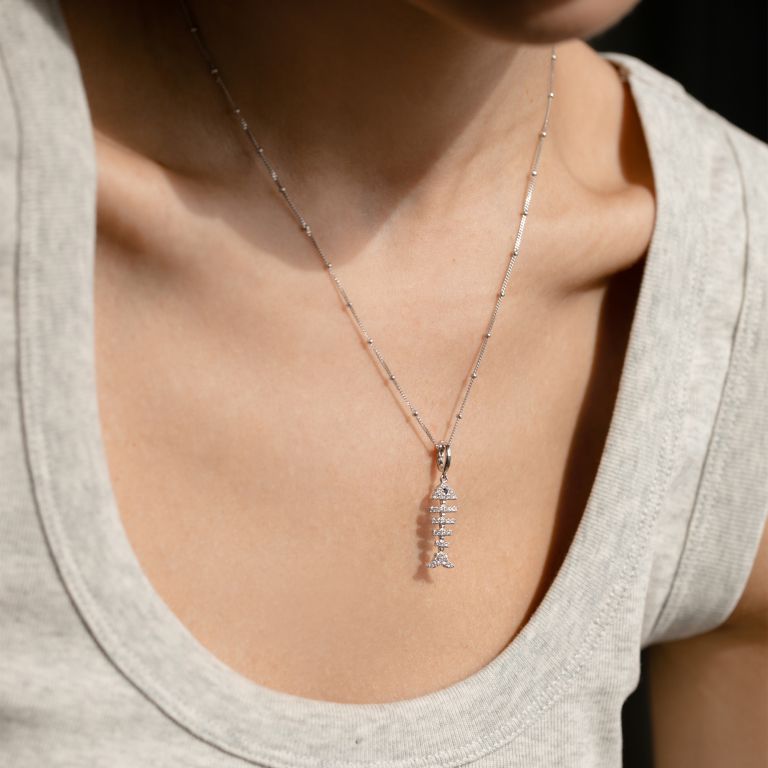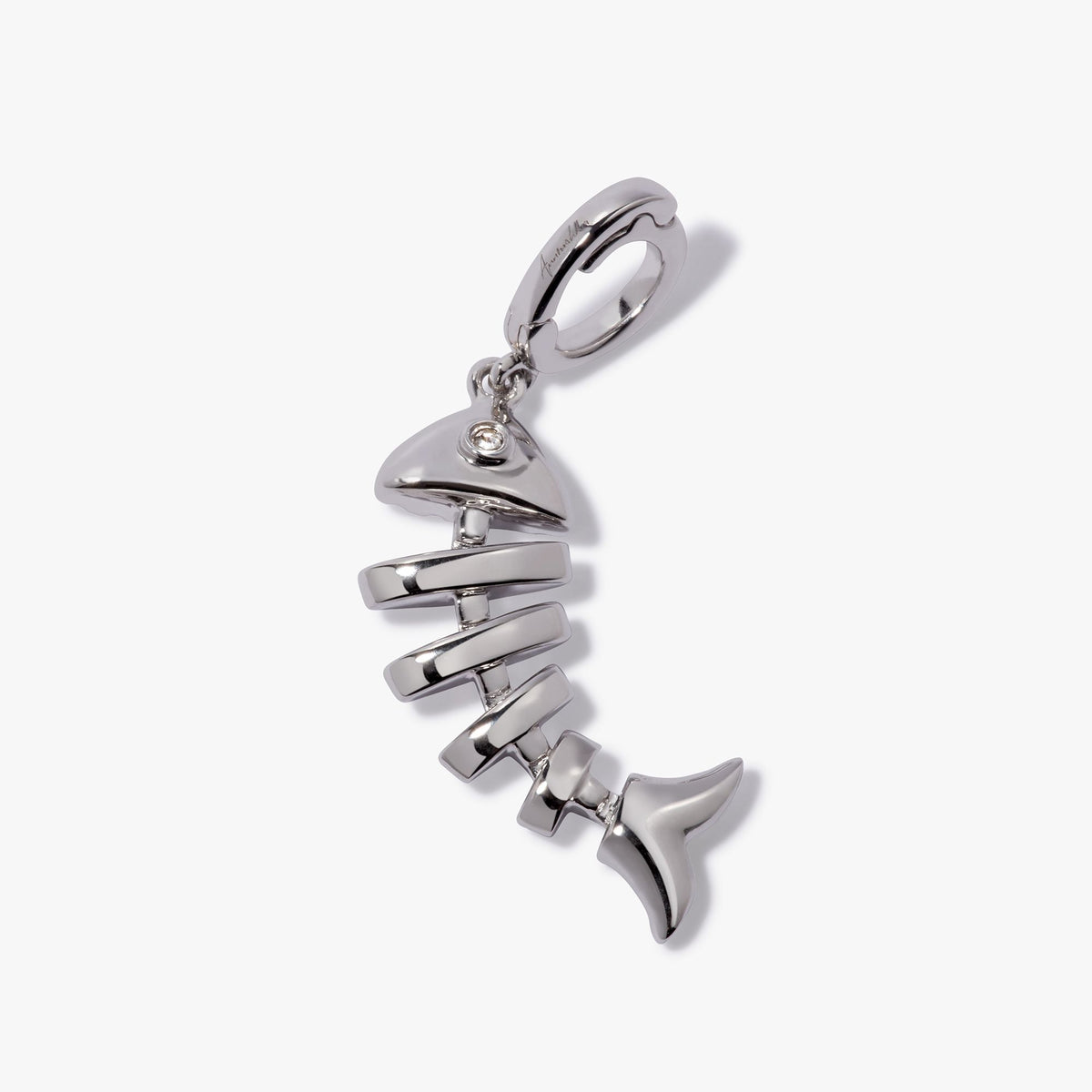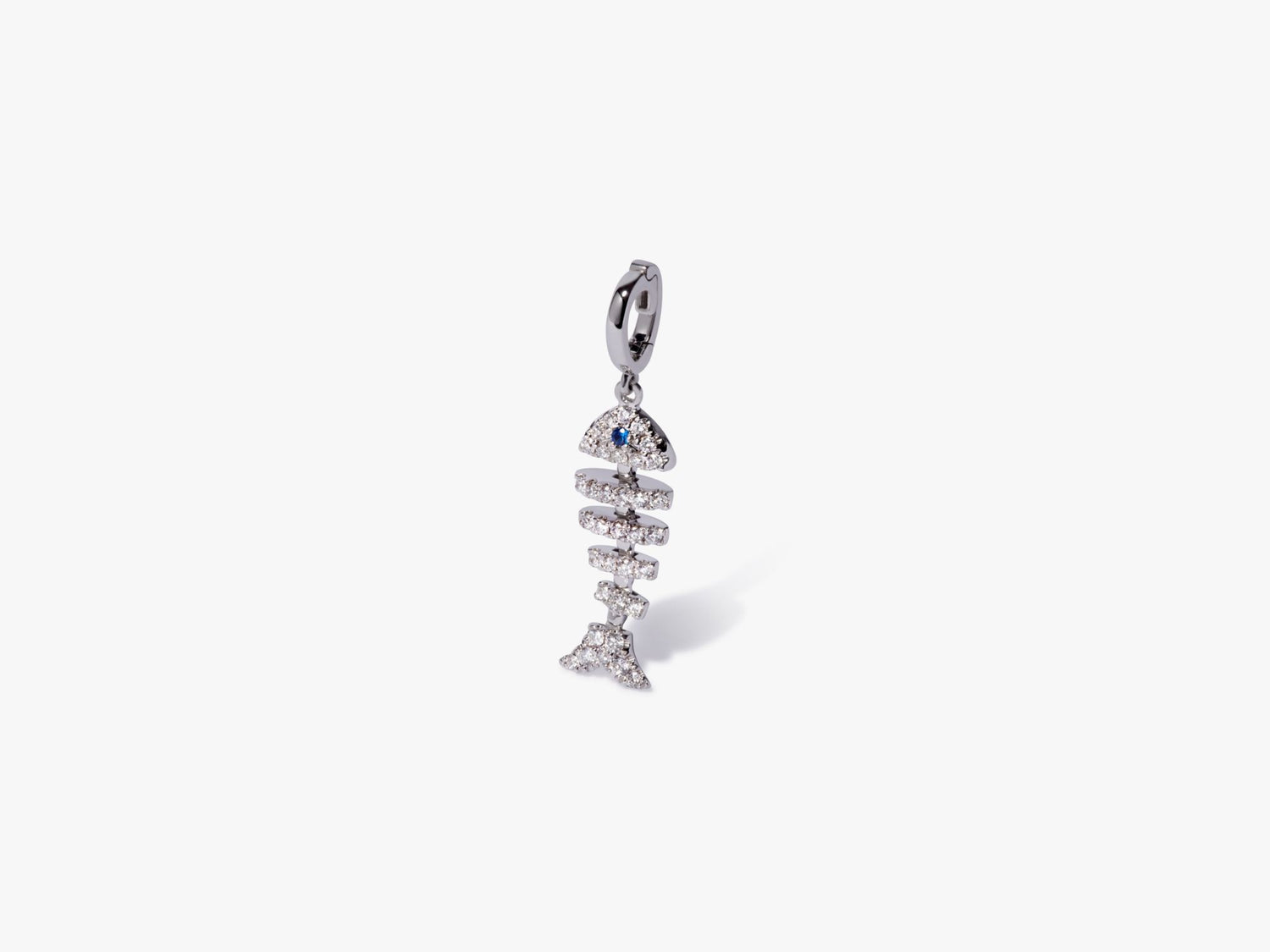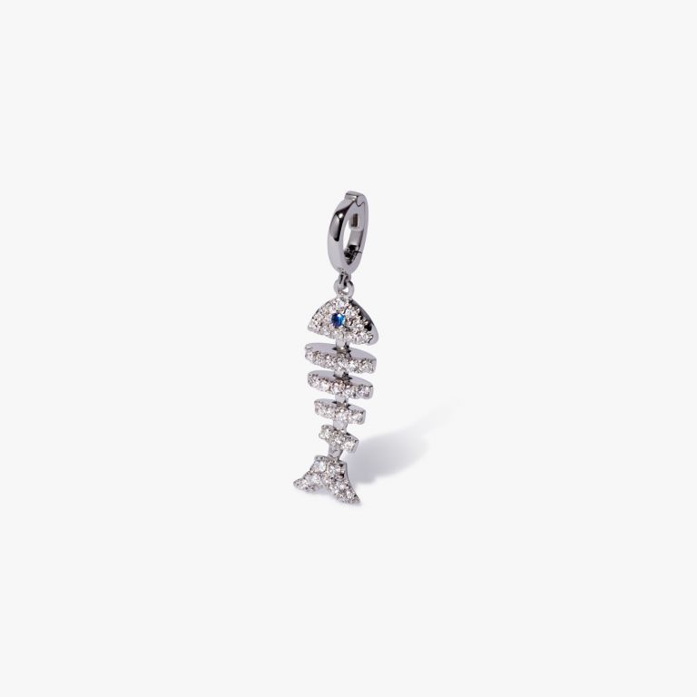 This Fish Bones Charm Pendant by Annoushka is a striking interpretation of survival and adaptability. Its articulated body mimics a swimming fish, while diamond-studded bones and a sapphire eye lend brilliance and mystery. A high-polish reverse completes the design, perfect for pairing with the Saturn Short Chain.
