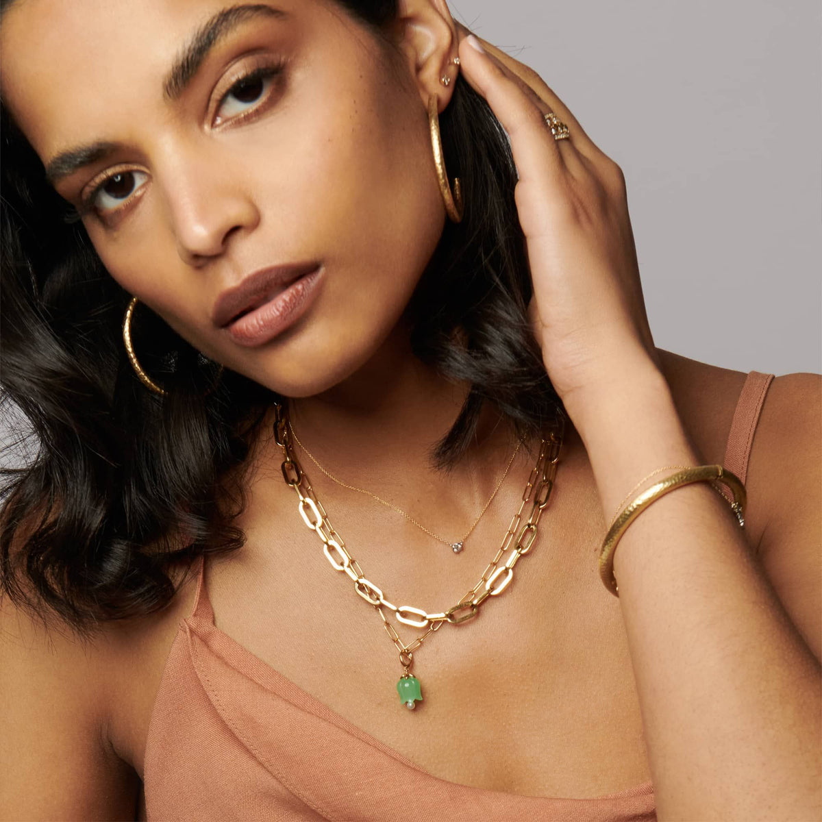 This Tulips Pendant by Annoushka is a tribute to nature’s elegance and meaningful beginnings. Carved from luminous jade and detailed with a swinging freshwater pearl, this sculpted tulip charm symbolizes prosperity and love. Perfectly paired with the Mini Cable Chain, it’s a fresh take on timeless floral beauty.