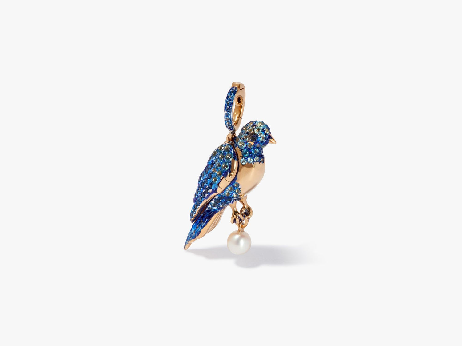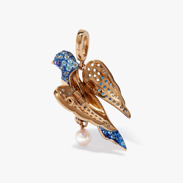 This Mythology Bluebird Charm Pendant by Annoushka is a poetic symbol of joy, love, and freedom. The bluebird’s sculpted wings open to reveal a hidden locket, while sapphires, topaz, and black diamonds animate the charm with vivid color and life. A seed pearl adds softness to this magical talisman.