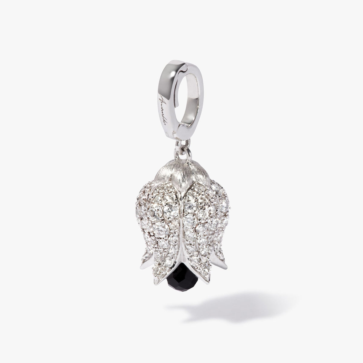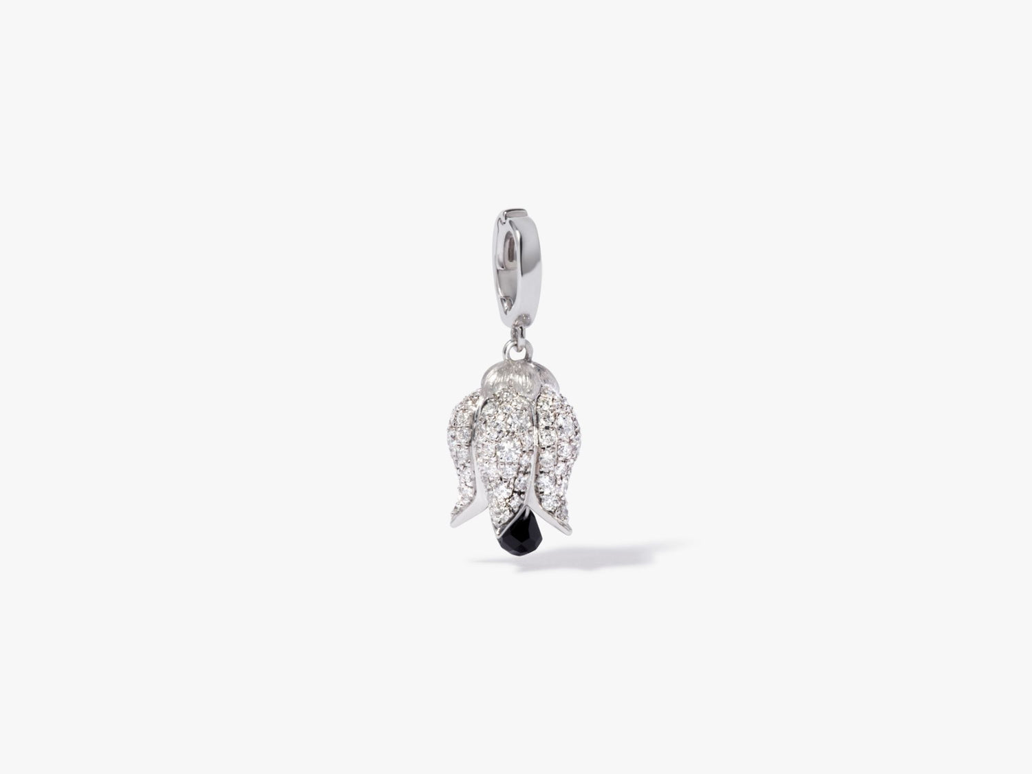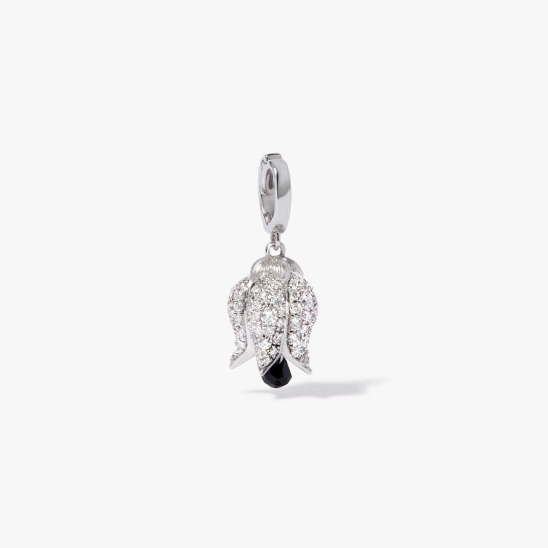 This Tulips Charm Pendant by Annoushka captures drama and elegance in a single bloom. Sculpted in white gold with diamond details, its black briolette spinel drop brings rich contrast and movement. Style it solo or in a tulip lariat for a poetic, layered look.