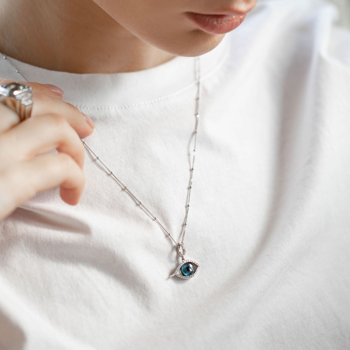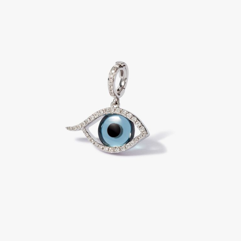 This Mythology Evil Eye Left Charm Pendant by Annoushka is a bold reinterpretation of a protective talisman. Crafted in icy white gold, the sleek evil eye flicks outward, featuring a London blue topaz center, black onyx, and shimmering silver diamonds. A shield of subtle strength and symbolic elegance.