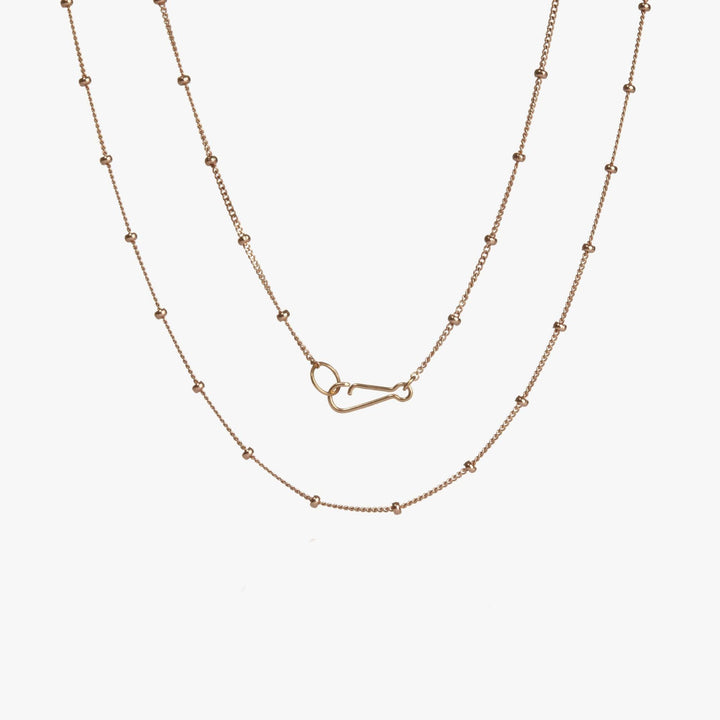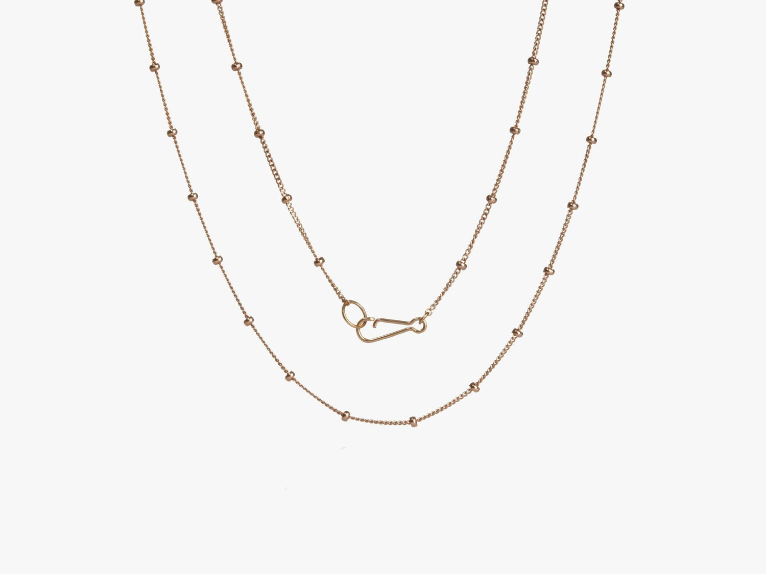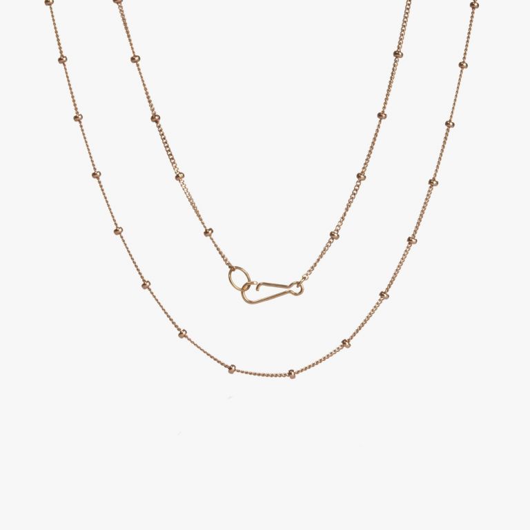 Handcrafted in 14k rose gold, 68 cm chain length, with miniature orbs, high-polish finish, and sprung clasp.