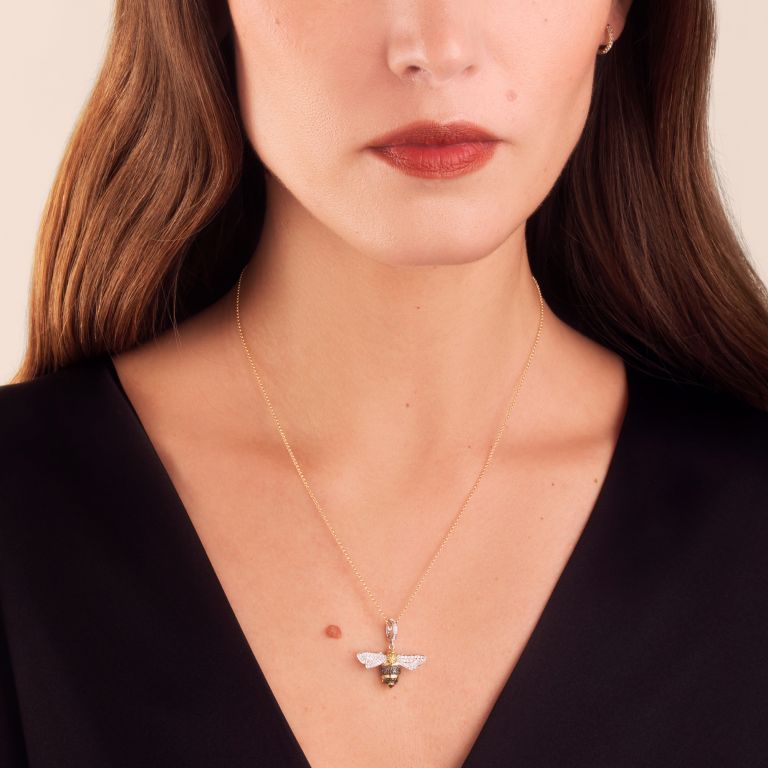 This Mythology Bee Charm Pendant by Annoushka is rich in storytelling and symbolism. Inspired by a Russian fairytale of transformation and devotion, the bee—crafted in glowing yellow and white gold with diamond-dusted wings—represents love and loyalty. With its finely striped body and graceful form, this charm makes a beautiful statement when paired with a gold chain.