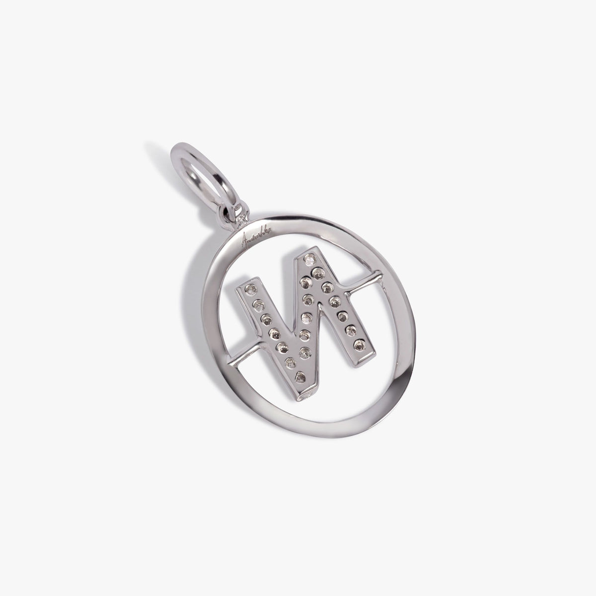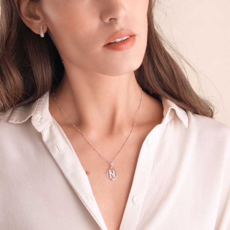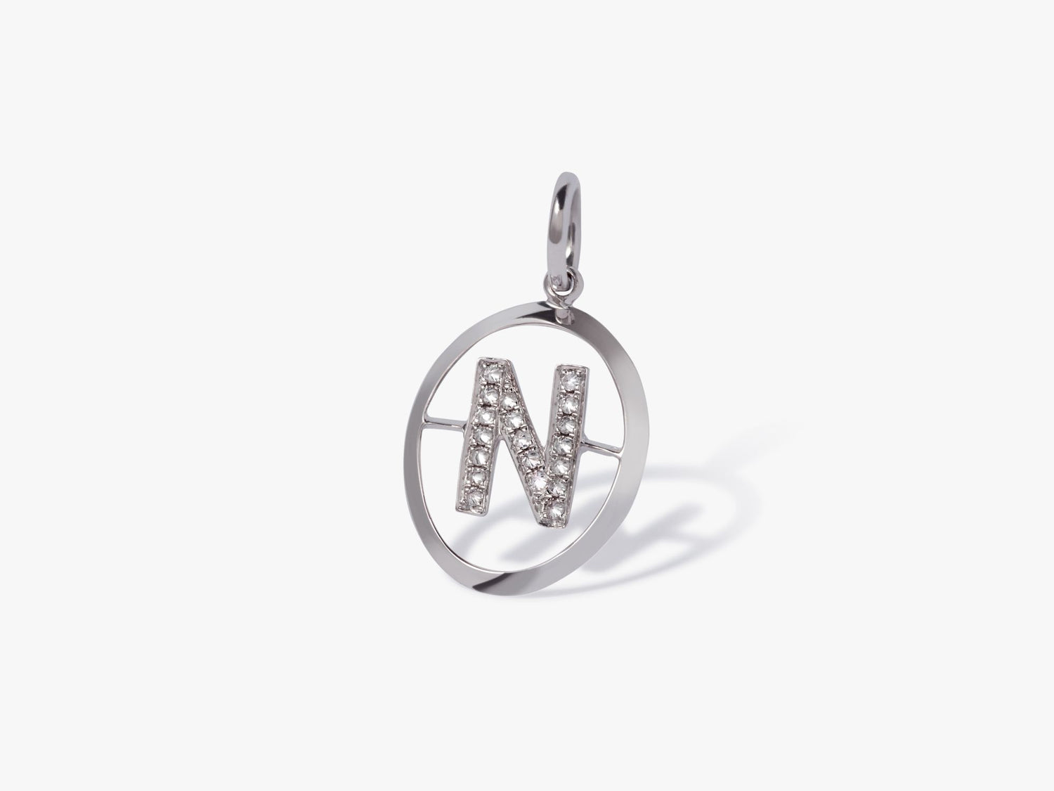 This Initials N Pendant by Annoushka is a graceful emblem of personal expression. Crafted in polished 18k white gold, the sculptural 'N' is hand-set with 19 shimmering silver diamonds totaling 0.1ct. Whether layered with other initials or styled solo, it brings a refined sense of identity to your jewelry story.