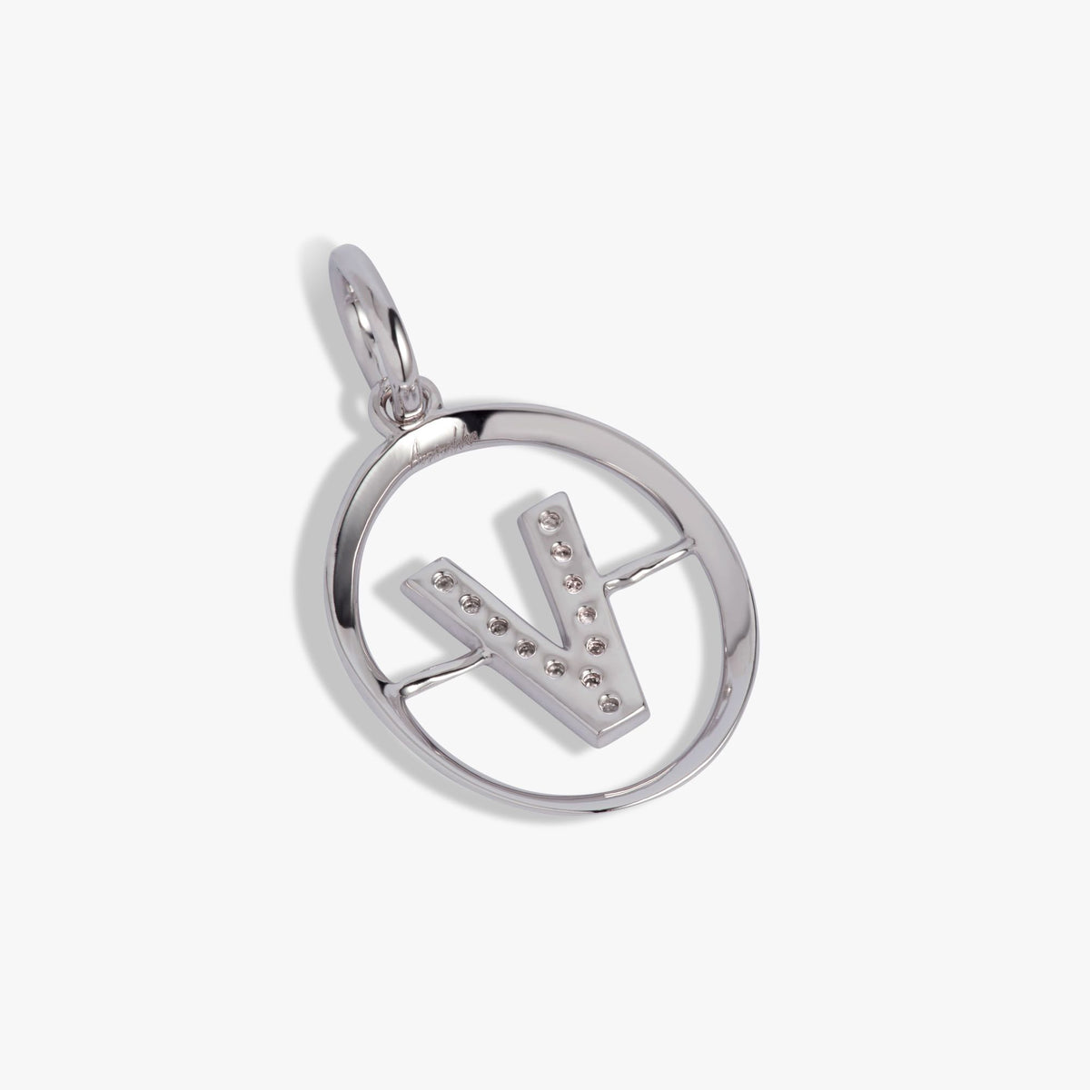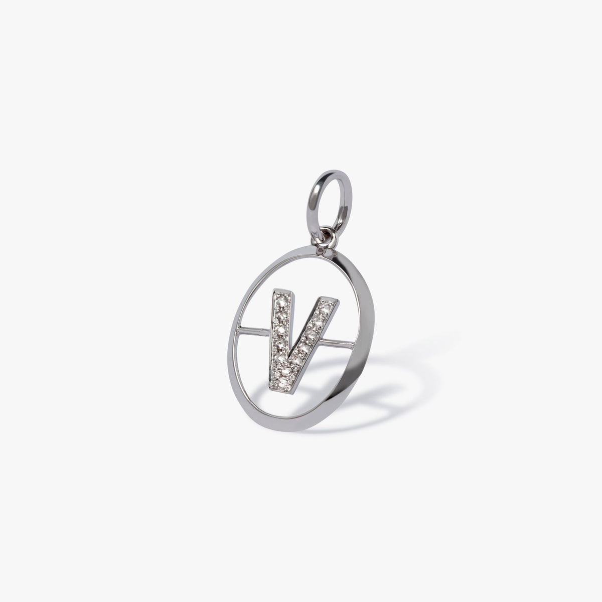 This Initials V Pendant by Annoushka is sleek, simple, and full of personal charm. Set with 12 silver diamonds totaling 0.07ct, its clean design in polished 18k white gold makes it a graceful statement of identity and love.