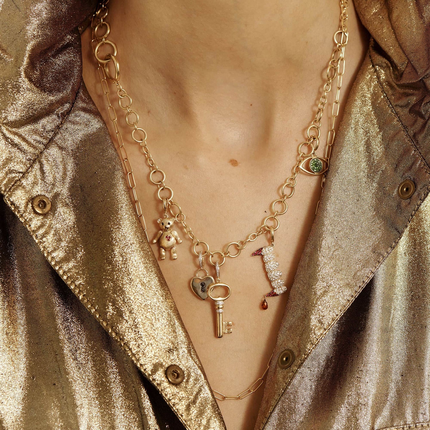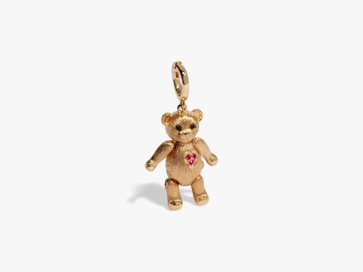 This Teddy Bear Locket Charm Pendant by Annoushka captures the innocence of childhood in a luxurious, whimsical form. Named Tuffy, this 18k yellow gold bear features black diamond eyes, a ruby heart, and moving arms and legs. With a textured tummy that opens into a locket, it’s both nostalgic and beautifully crafted.