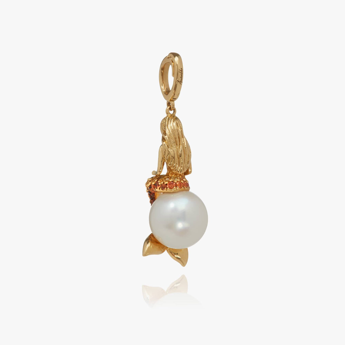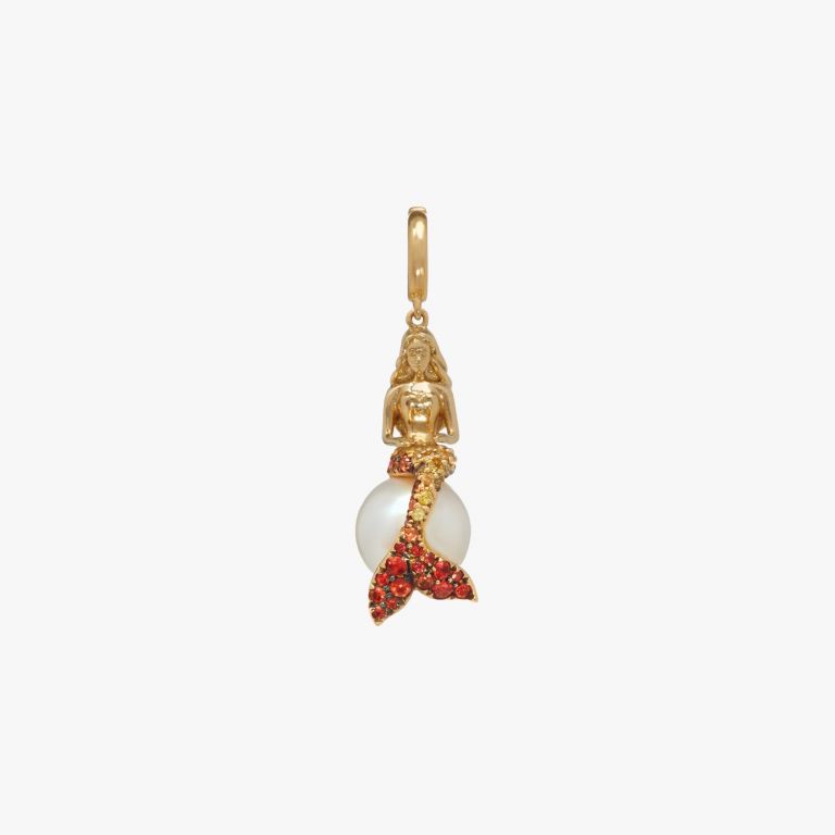 This Mermaid Charm Pendant by Annoushka is a dreamlike creation inspired by myth and music. A collaboration with The Vampire’s Wife, it draws from Nick Cave’s ethereal song ‘Mermaids’ and features a sensuous siren crafted in 18k yellow gold. With a gleaming pearl and a sapphire-studded tail in fiery sunset hues, this charm radiates enchantment and individuality.