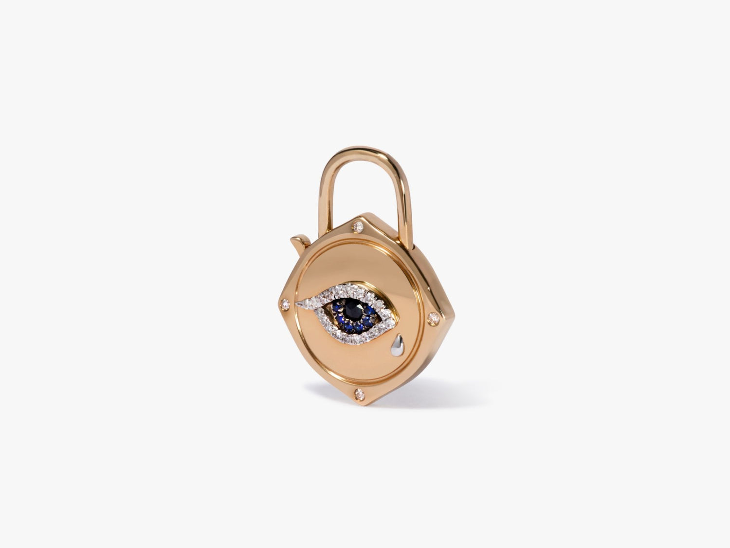 This Lovelock Evil Eye Charm Pendant by Annoushka blends protection, symbolism, and personal style. The central sapphire and diamond evil eye motif is a talisman of safety and intuition. Featuring a hinged lock-style design, it’s a versatile connector for chains and bracelets. A beautiful fusion of utility and emotion, this charm celebrates love, security, and timeless tradition.