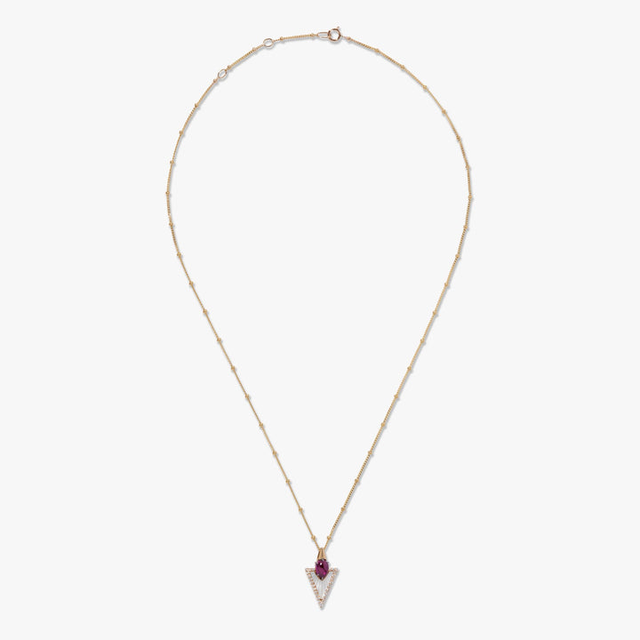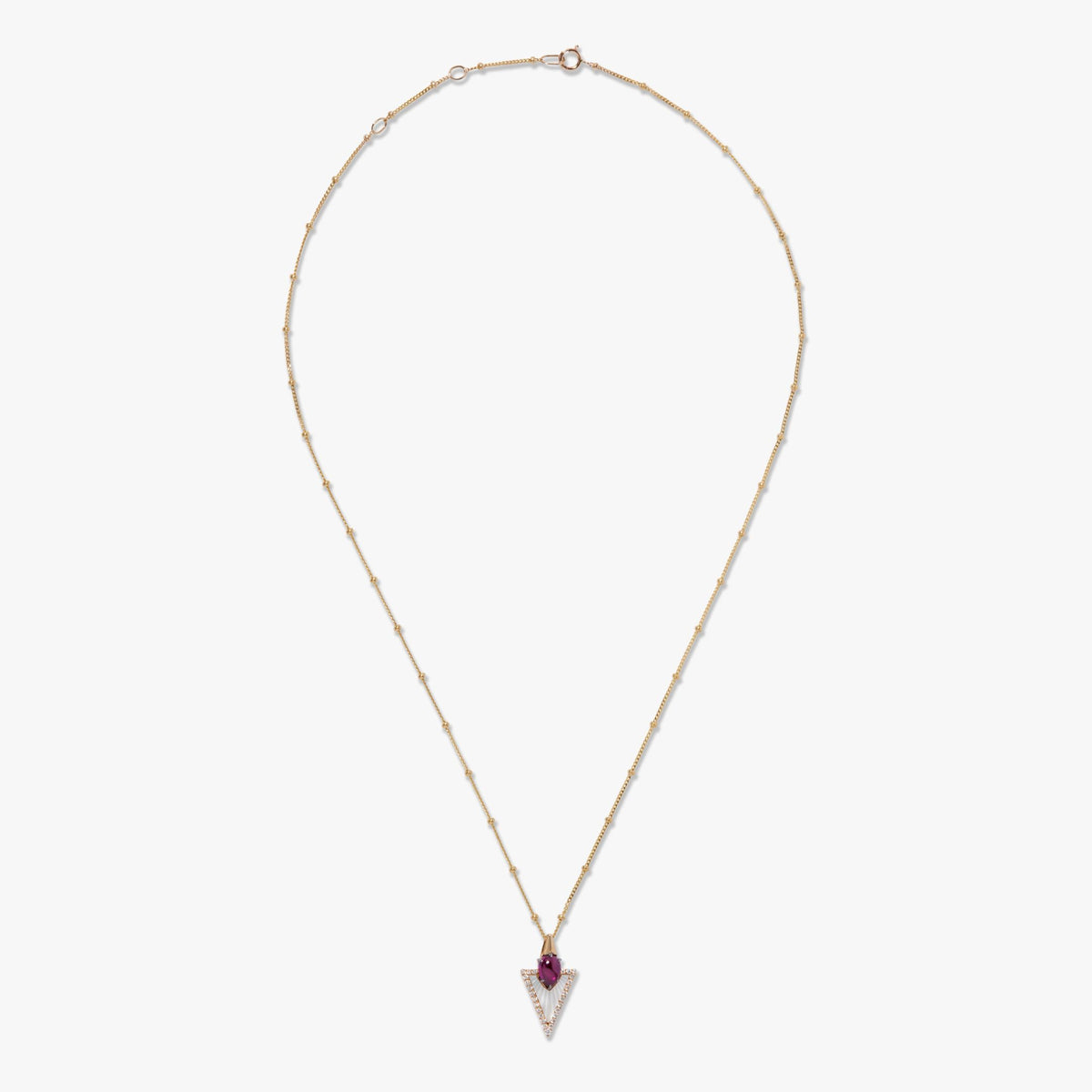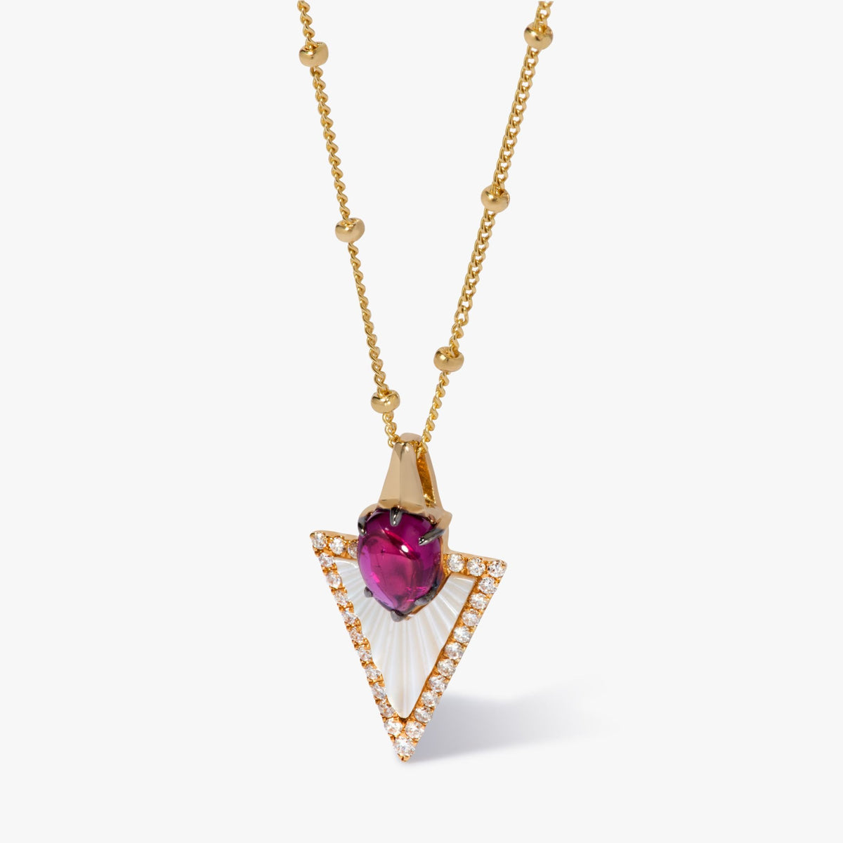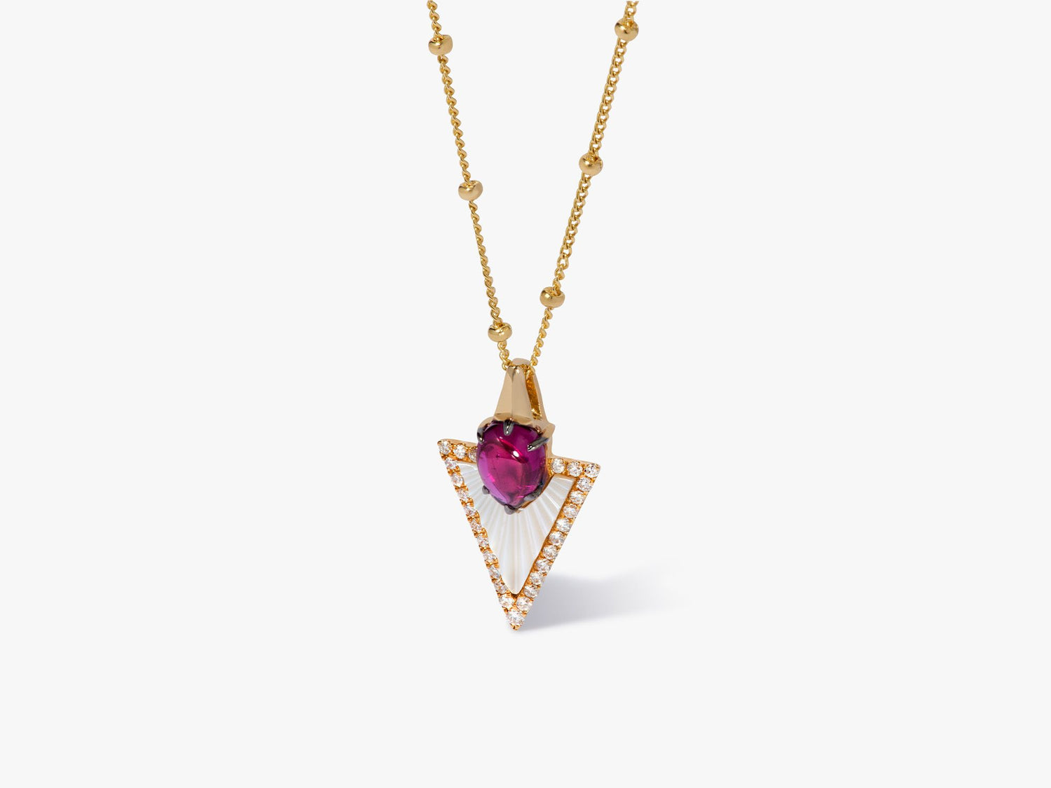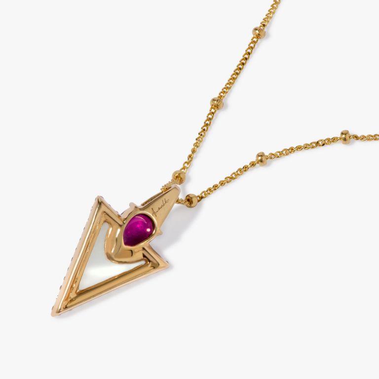 This Kite Necklace by Annoushka is a refined architectural piece that merges symbolism with geometric beauty. A carved mother of pearl arrowhead—framed in diamonds and set with rhodolite garnet—hangs gracefully from a golden Saturn chain. Drawing from Art Deco influences, it symbolizes courage, progress, and peace. Wear solo or with the matching earrings for a harmonious look.
