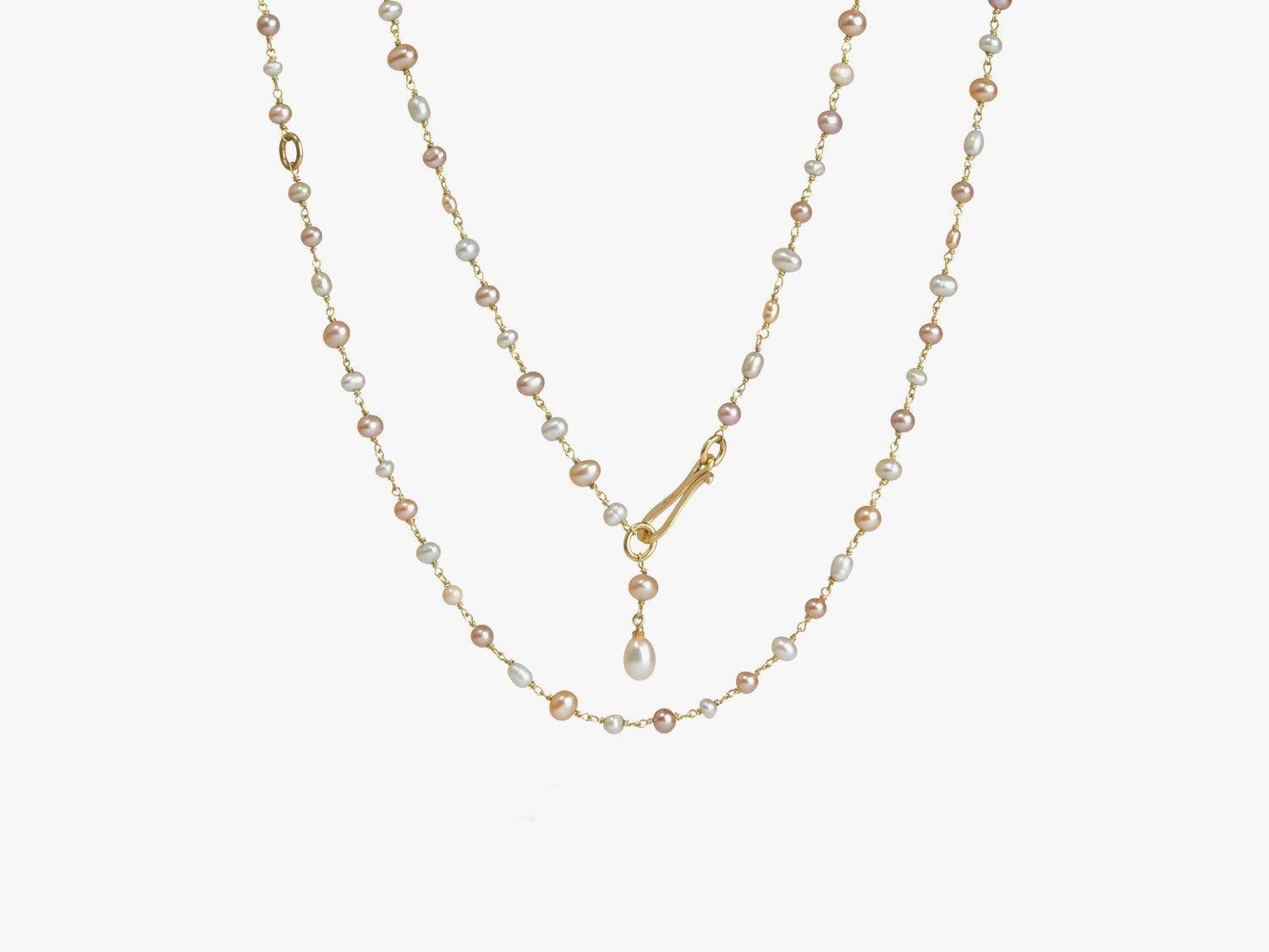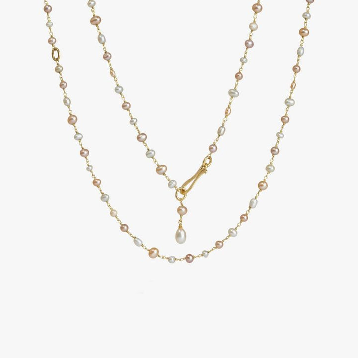 Handcrafted in 18k yellow gold with pastel freshwater seed pearls. 90cm length with hook clasp.