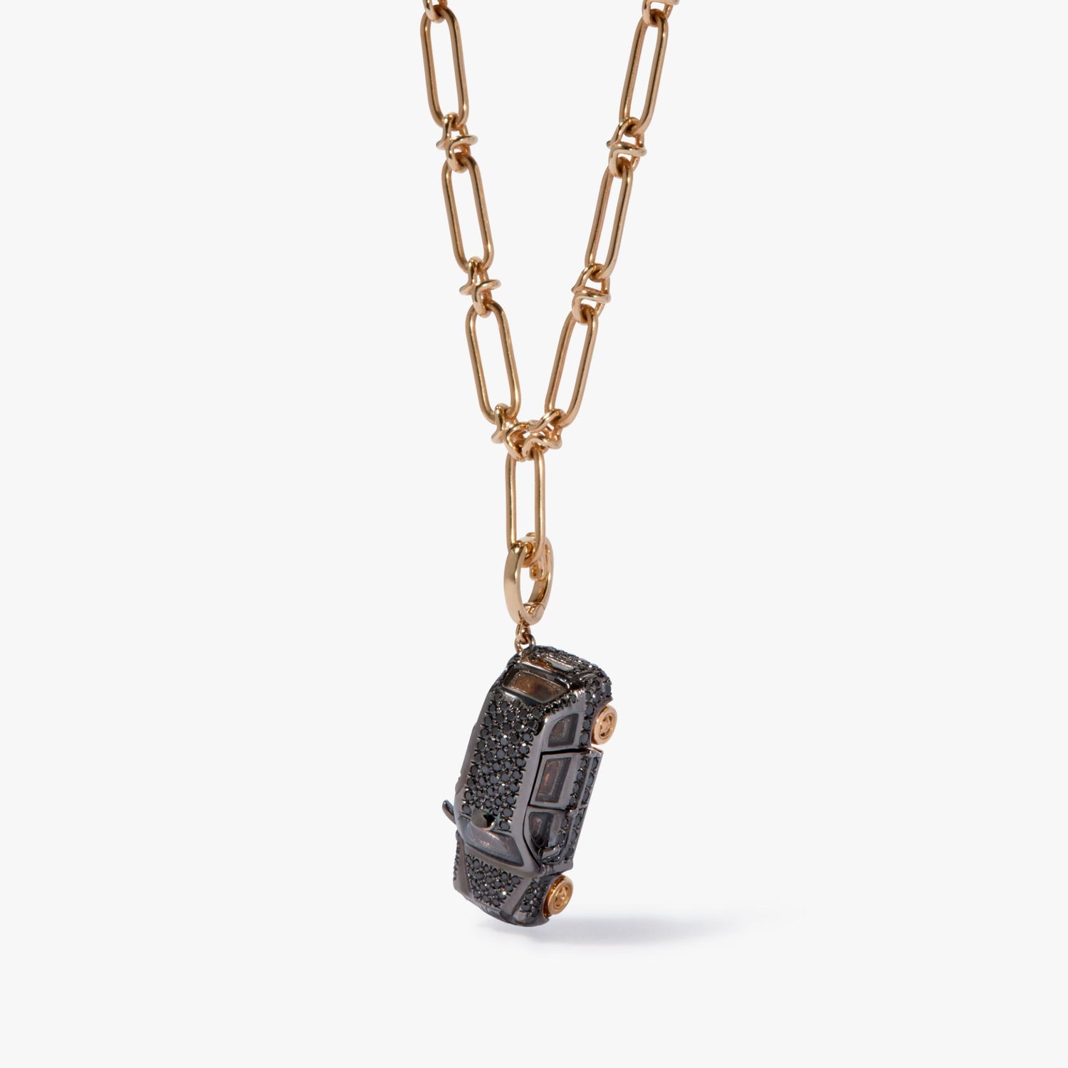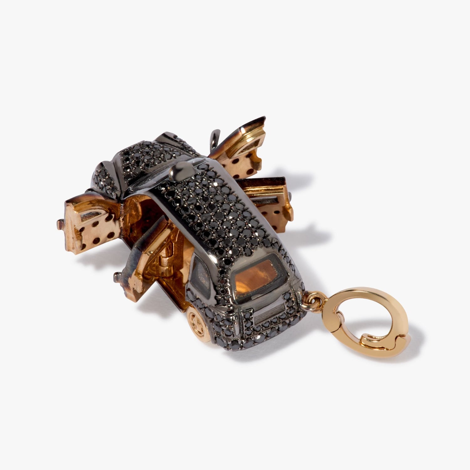 Handcrafted in 18k yellow gold with black diamonds and clear quartz windows. Features moving parts including spinning wheels and opening doors. Charm pendant design.