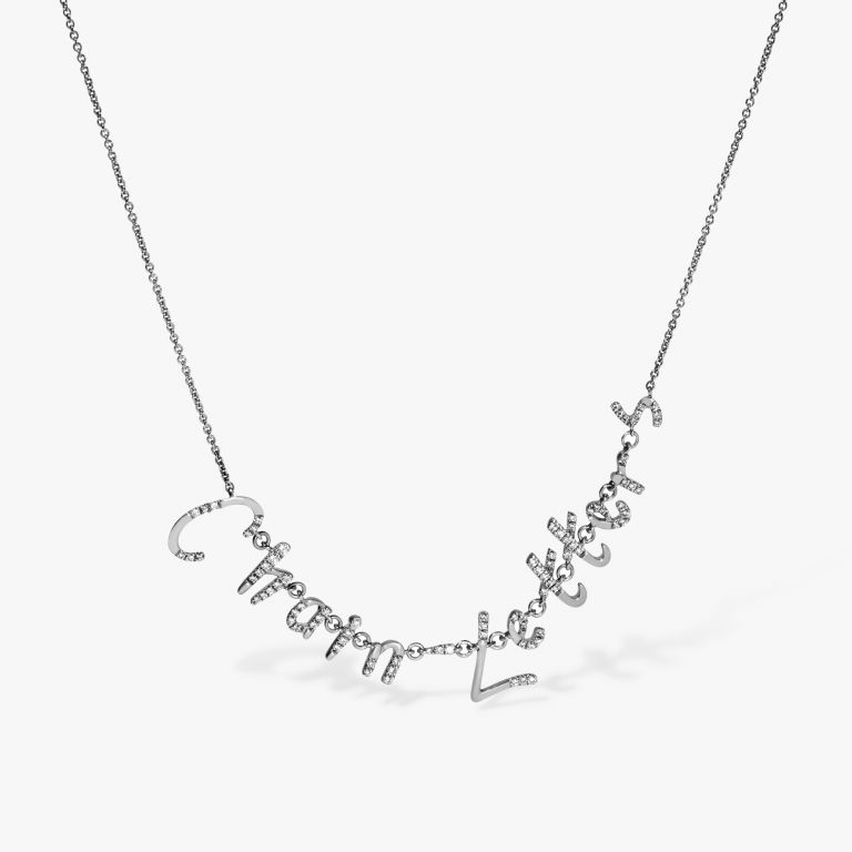 This Chain Letters Personalised Necklace by Annoushka comes in solid 18k white gold and diamonds. Handmade for you, it can be customized with names or phrases. Adjustable with a sizing slider, it offers versatile styling alone or layered with other 18k gold pieces.