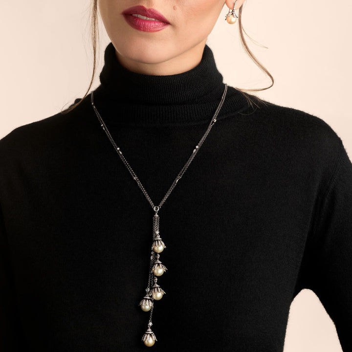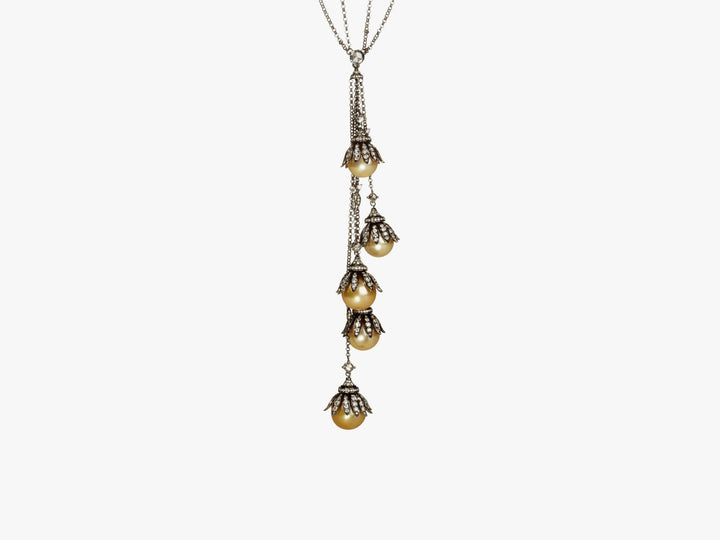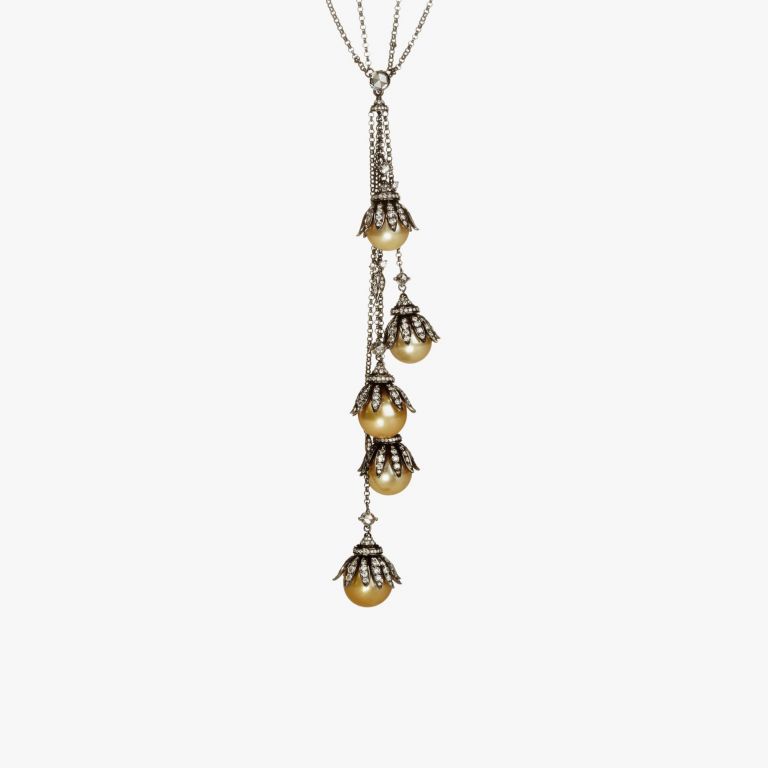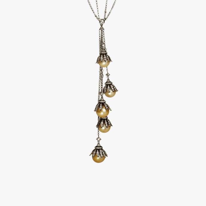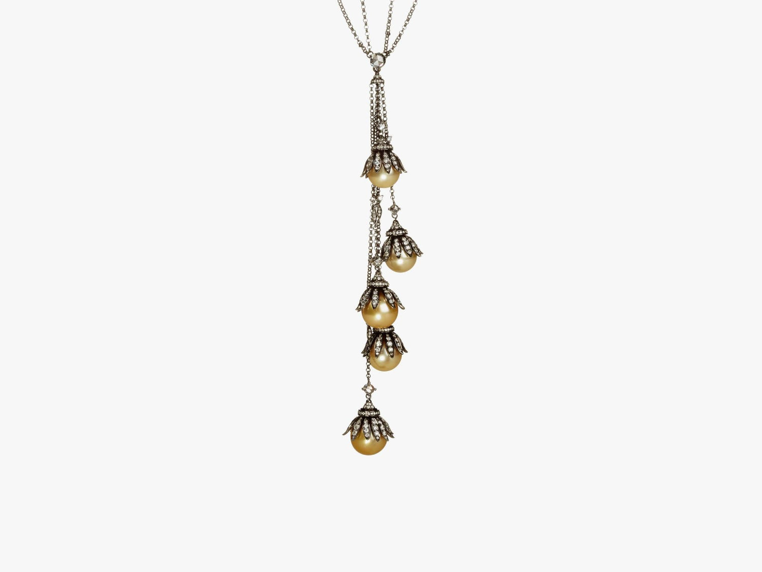 This Golden Pearls Necklace by Annoushka is a radiant tribute to the Philippines and Art Deco glamour. Crafted in 18k white gold, it features 581 meticulously set stones, including 6.21ct diamonds, intertwined with cascading lustrous golden South Sea pearls. Finished in black rhodium and high polish, each uniquely sized and colored pearl celebrates natural beauty and timeless elegance.