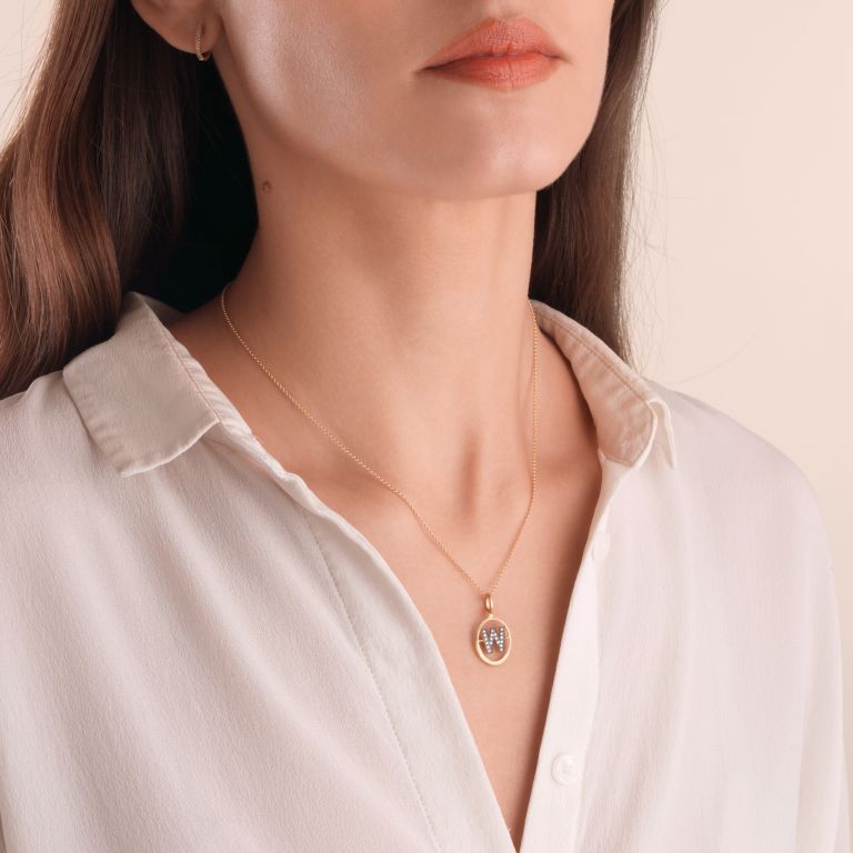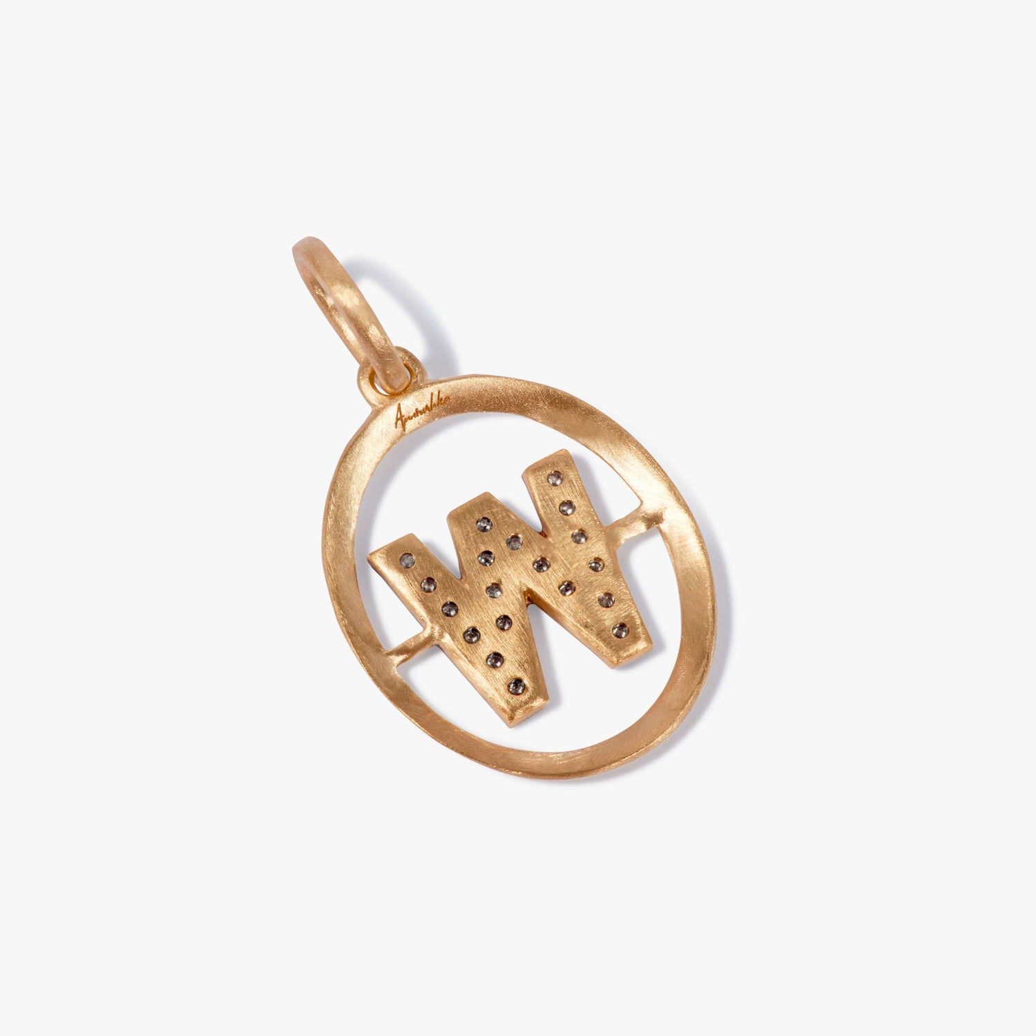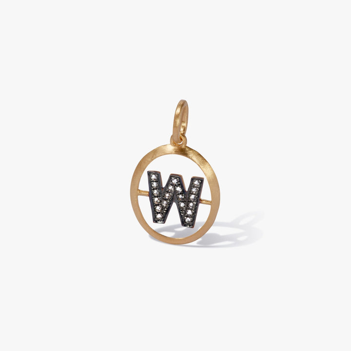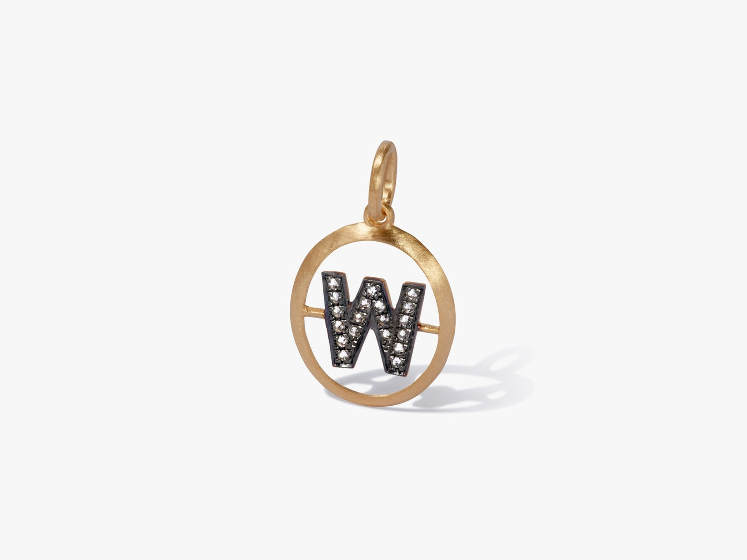This Initials W Pendant by Annoushka is a textured statement in solid 18k yellow gold with a soft satin finish. The letter ‘W’ dazzles with 0.10 carats of silver diamonds micro-pavé set into black rhodium, marrying tradition and modern style. Perfect worn solo or layered. Customisable in 18k rose gold.