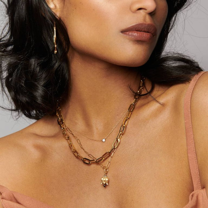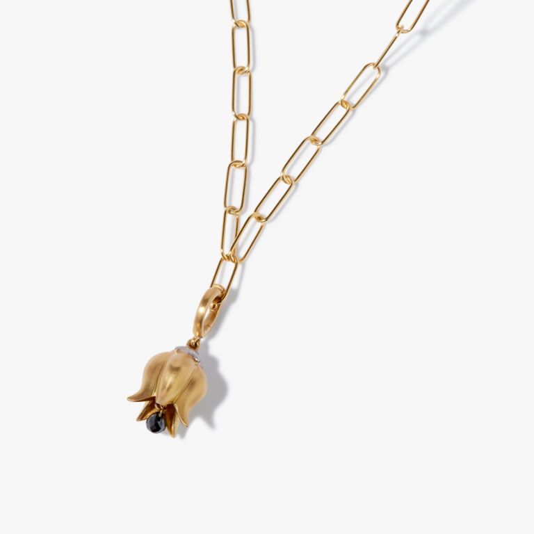 This Tulips Necklace by Annoushka is a blooming tribute to nature’s quiet elegance. Suspended delicately from a fine gold chain, a tulip-shaped charm cradles a deep pink briolette spinel that peeks from its downturned bloom. Rich in symbolic meaning and organic detail, this piece is perfect for those drawn to floral beauty and artisanal storytelling. Ideal for layering or worn as a solo centerpiece.