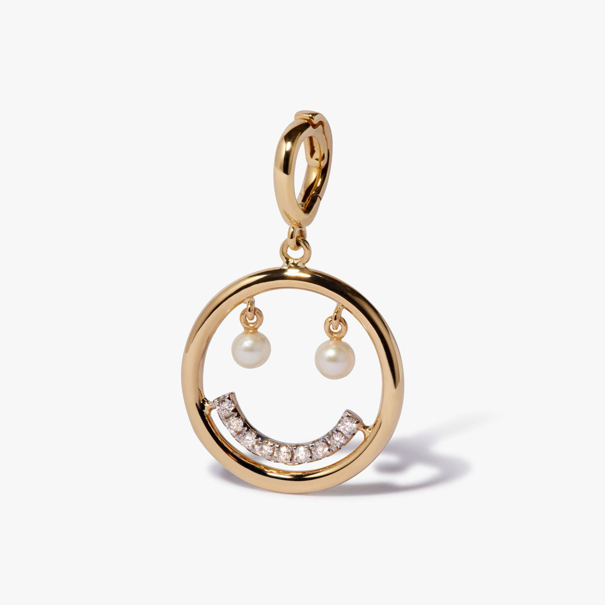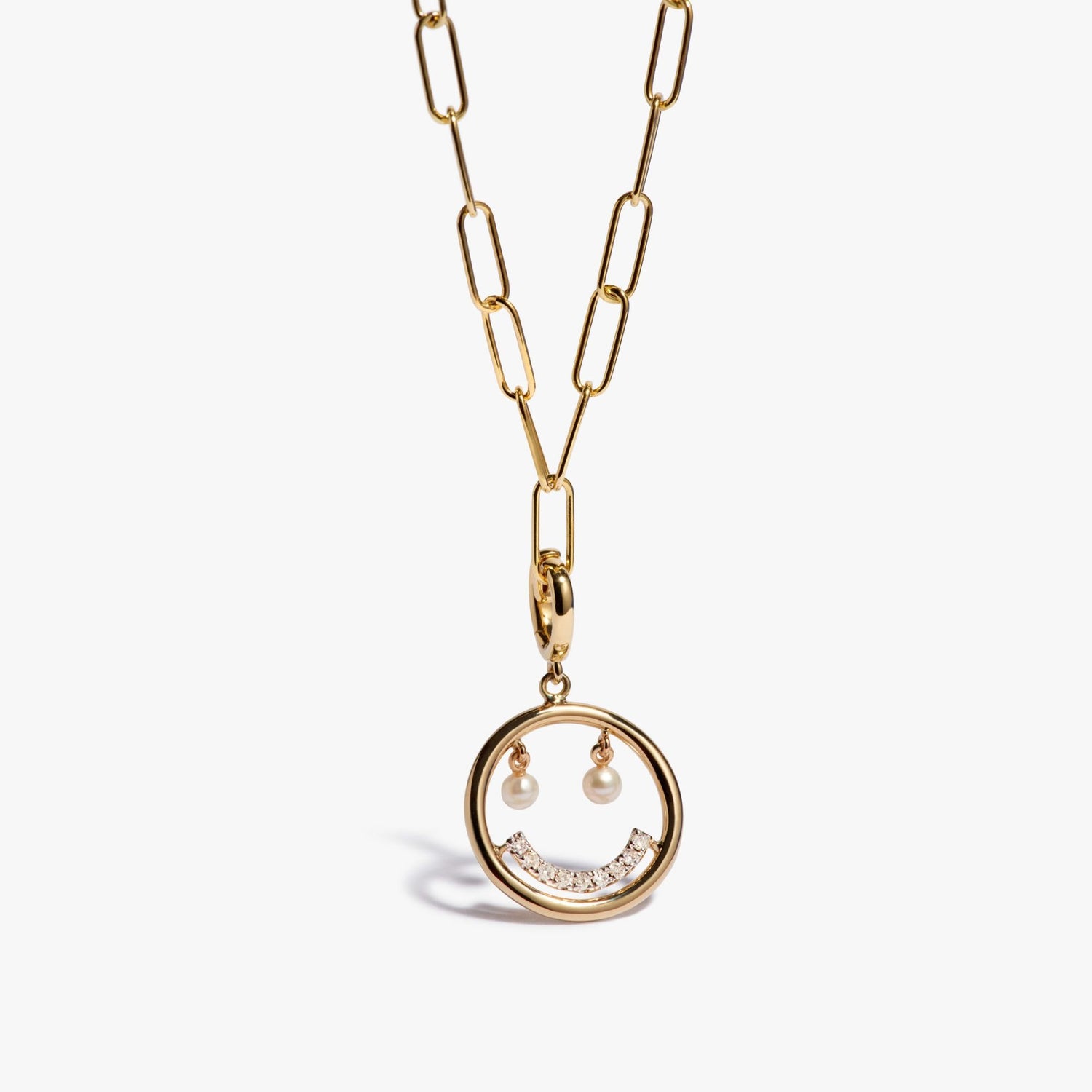 This Happy Charm Necklace by Annoushka is a joyful expression of optimism. Cast in gleaming 18k yellow gold, the smiley face charm sparkles with diamond-set features—two freshwater pearls for eyes and five pave diamonds forming a subtle grin. Designed to hang from any Annoushka chain via a flexible bail clasp, this uplifting piece is an invitation to embrace joy, whether gifted or worn as a daily reminder of happiness.