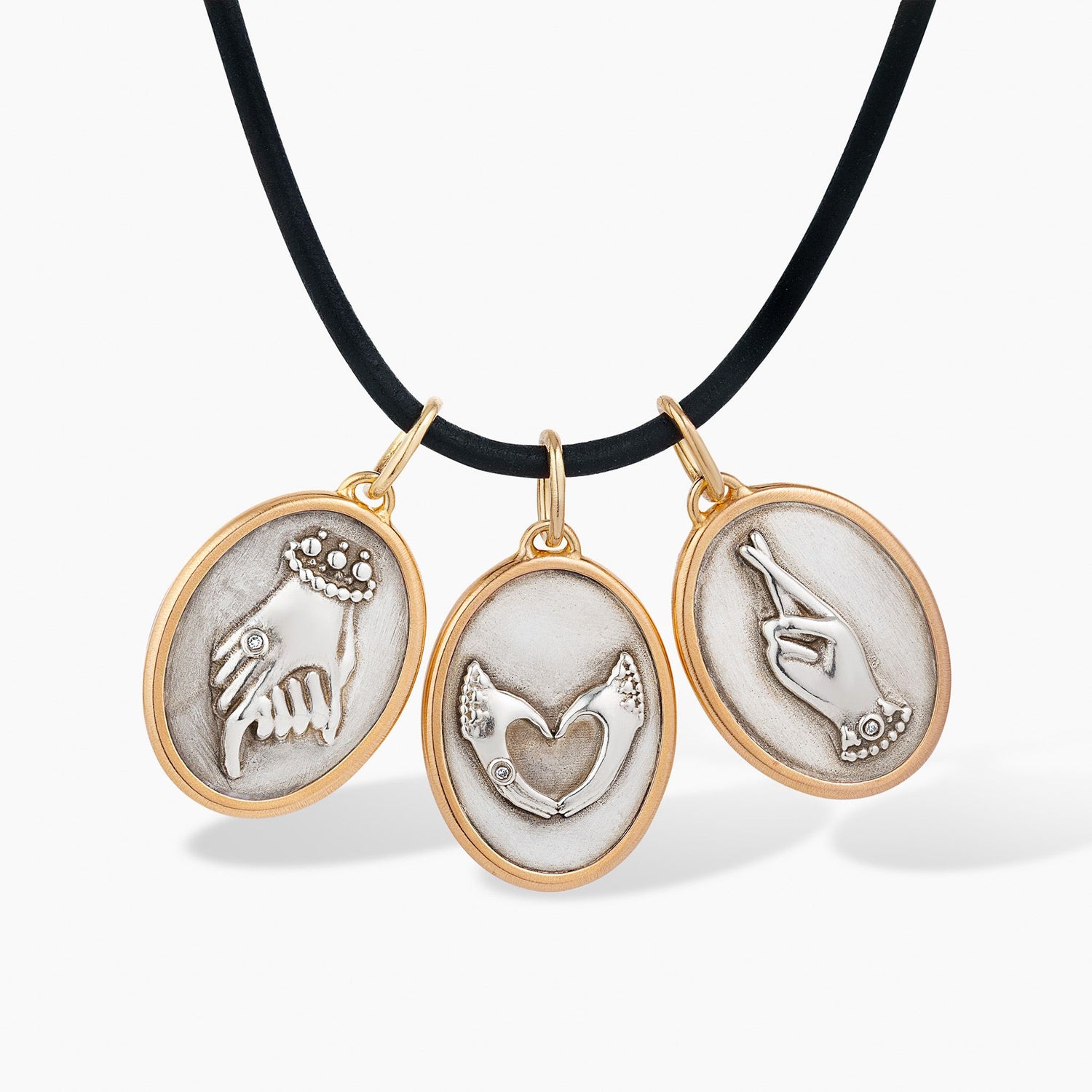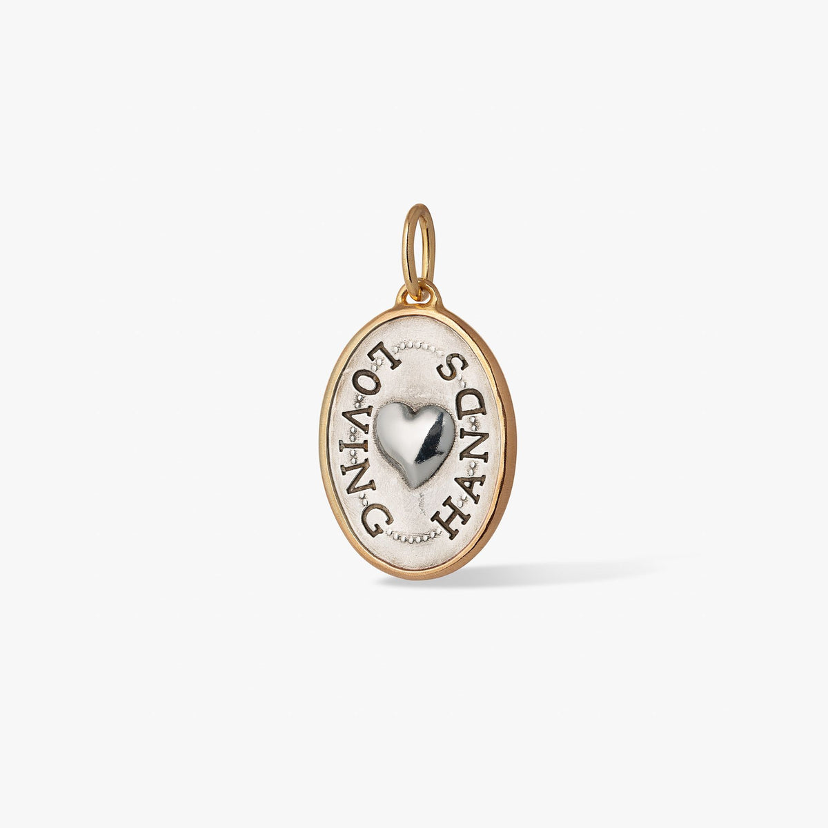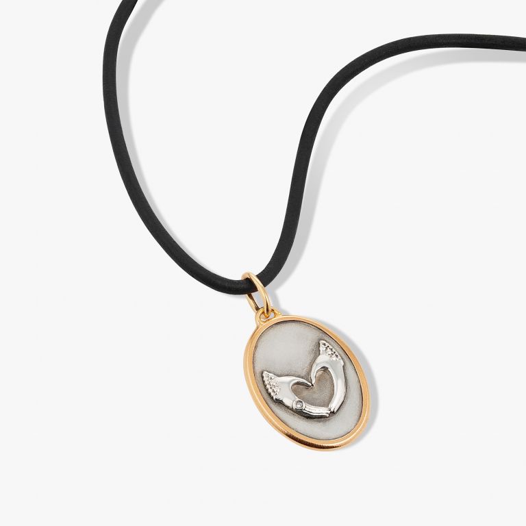 This Loving Hands Pendant by Annoushka is an emblem of human connection and care. Crafted in sterling silver and framed in warm 14ct yellow gold, the oval medallion features sculptural hands holding each other—symbolizing friendship, peace, and support. A single diamond offers a quiet brilliance, while the back reveals a heart surrounded by the words “helping hands.” Strung on a black leather cord, this pendant is as meaningful as it is beautiful—and supports a powerful cause through The King’s Trust.