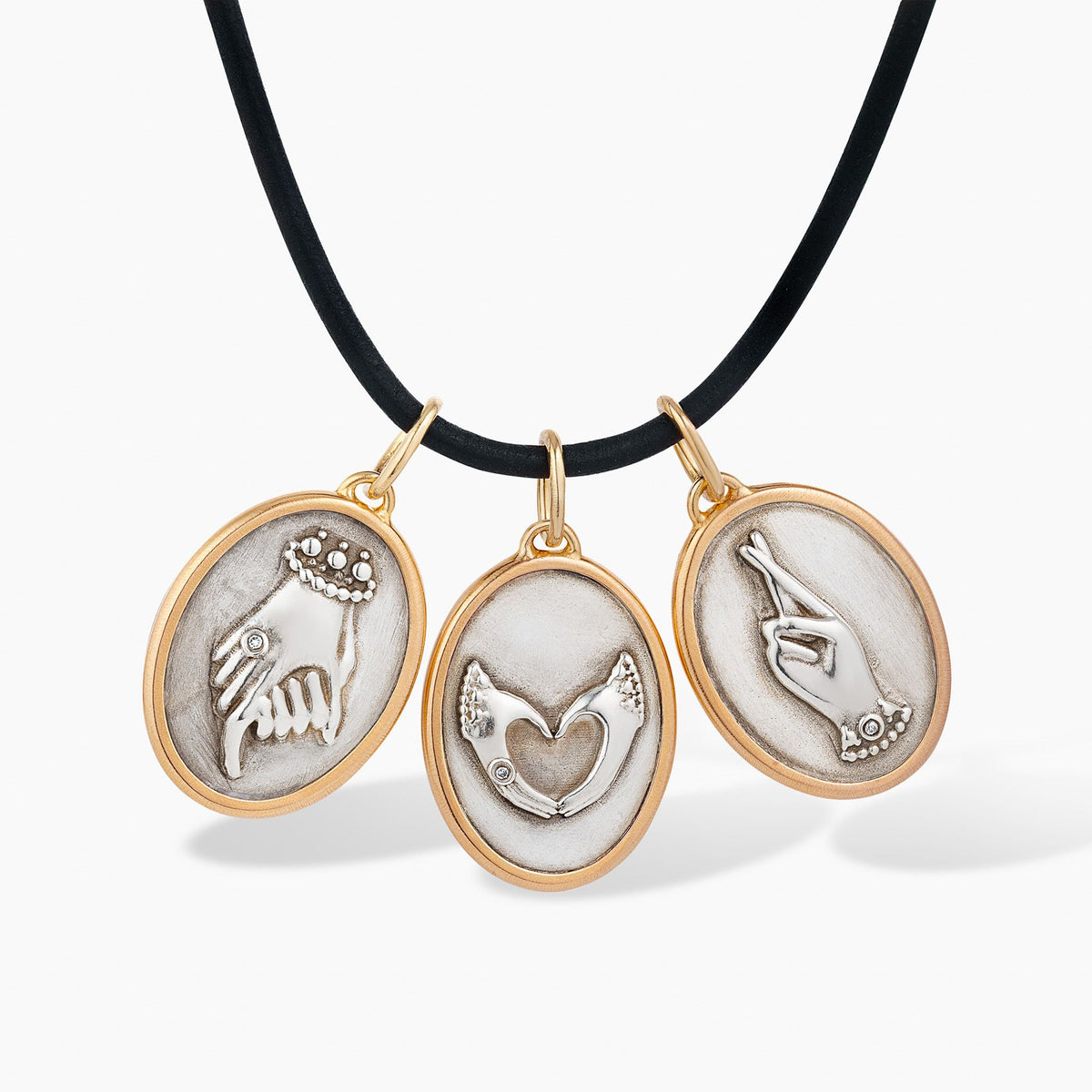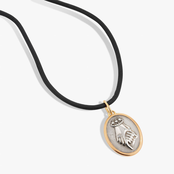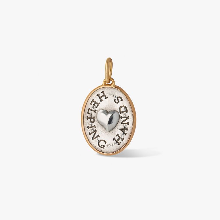 This Helping Hands Pendant by Annoushka is a meaningful symbol of mentorship, empowerment, and compassion. Cast in sterling silver and framed in 14ct yellow gold, the medallion is adorned with sculptural hands holding—representing peace, support, and protection—and set with a single sparkling diamond. A convex heart on the reverse is encircled by the words 'helping hands,' evoking kindness and unity. Each pendant is sold in support of The King’s Trust and comes on a versatile black leather cord.