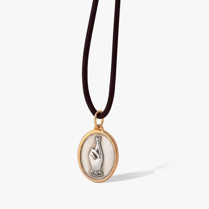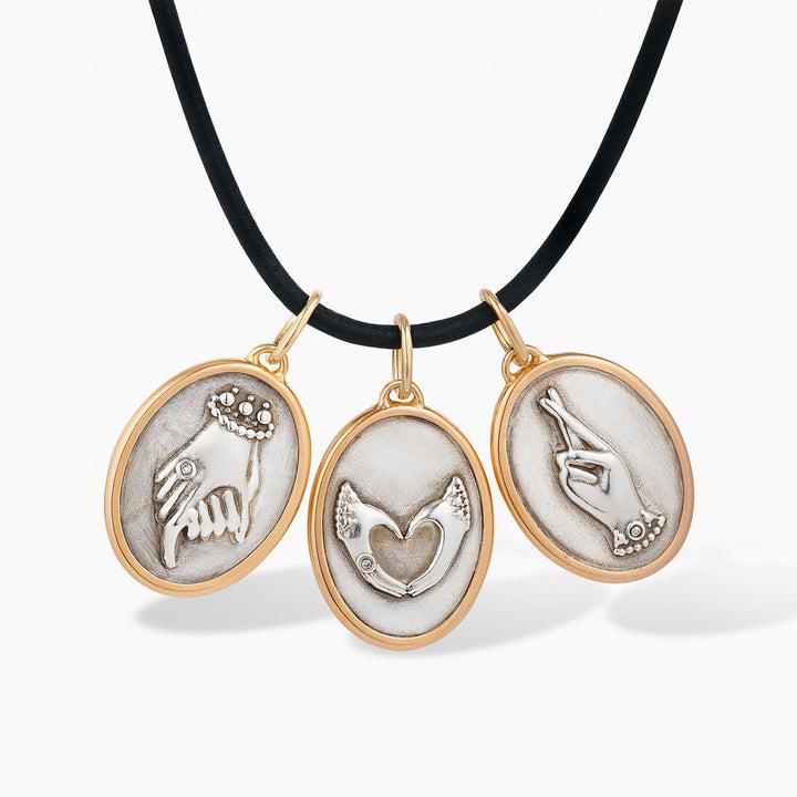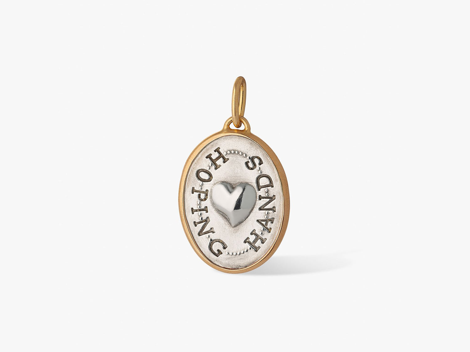 This Hoping Hands Pendant by Annoushka is a poetic talisman for courage and transformation. Celebrating self-confidence and belief, the oval medallion is crafted in sterling silver and encased in a 14ct yellow gold frame. Two clasped hands—symbolic of strength, peace, and hope—are sculpted in relief on the front, while the reverse features a heart and engraved words “helping hands.” A portion of each sale supports The King’s Trust’s efforts to change girls’ lives for the better.