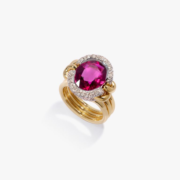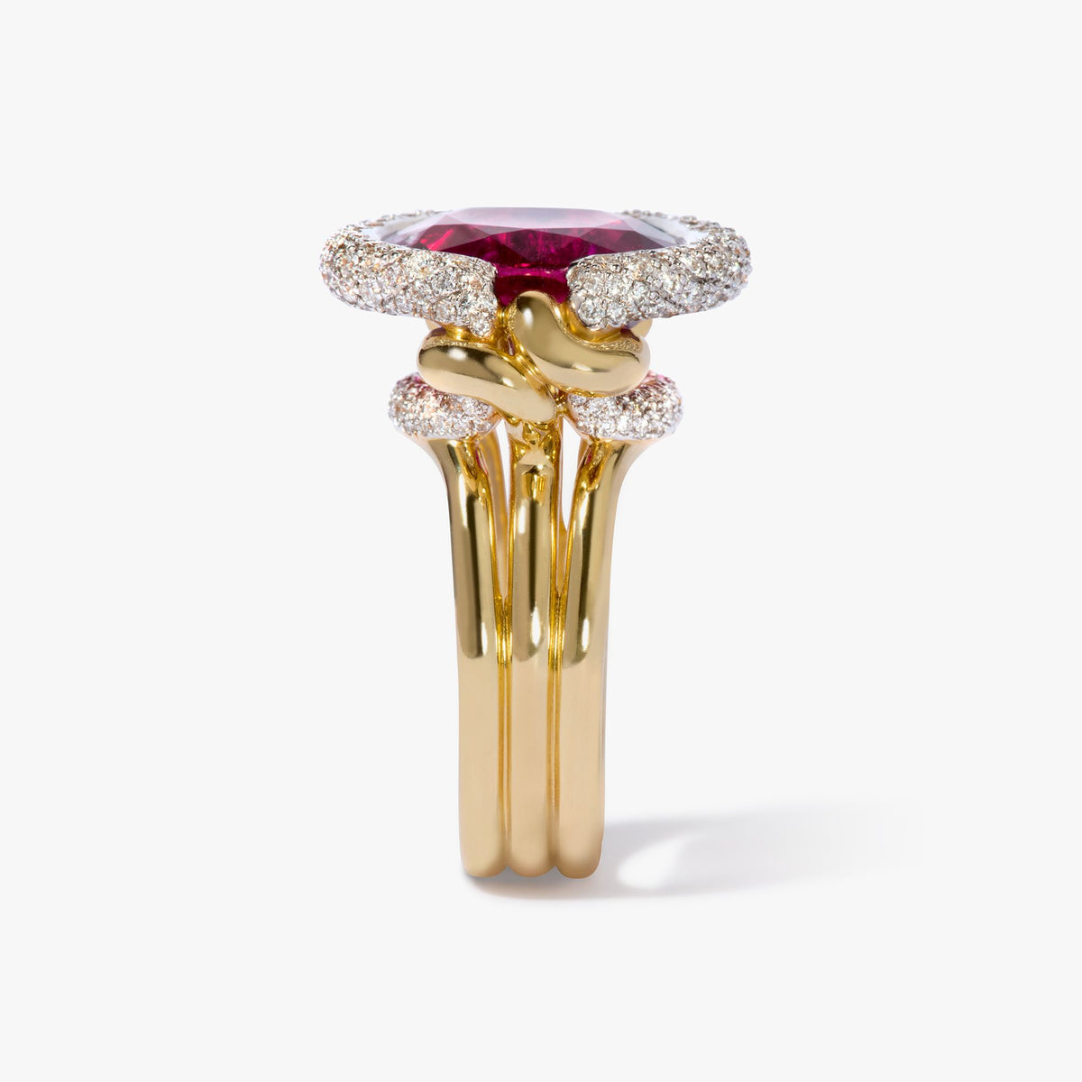 This Knuckle Dust Rubellite Tourmaline & Diamond Ring by Annoushka is a vibrant cocktail ring that radiates strength and passion. At its center, a glowing rubellite tourmaline is encircled by a halo of diamonds. Crafted in rich gold, it’s ideal worn solo or stacked, and pairs beautifully with the matching earrings.