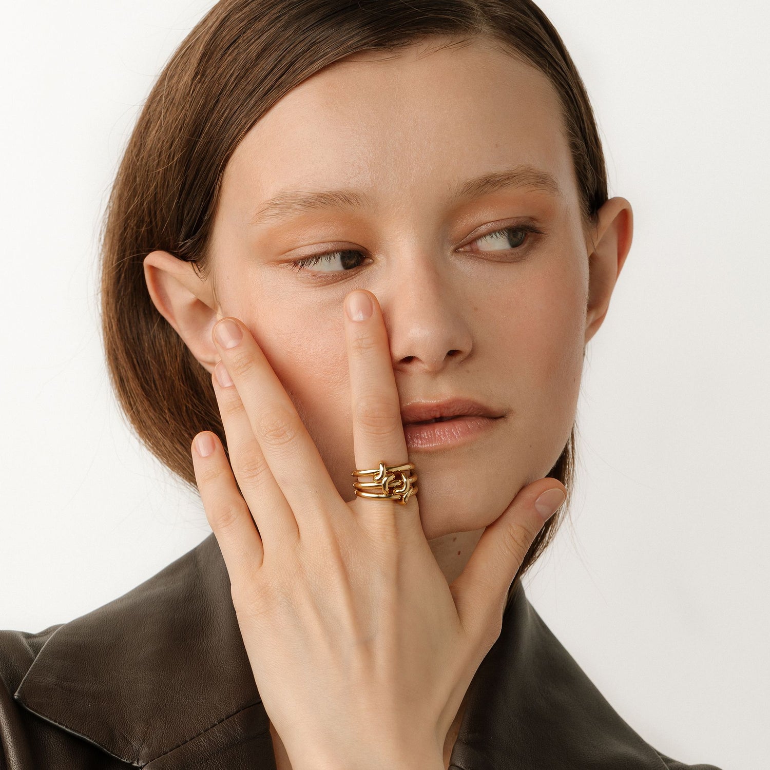 This Knuckle Tri Ring by Annoushka redefines modular elegance with inventive design. Crafted in 14k yellow gold, three fine bands are joined by subtle joints allowing fluid movement and styling versatility. Wear across multiple fingers, stack as one, or connect with Knuckle chains—this ring is a true chameleon of contemporary jewelry.
