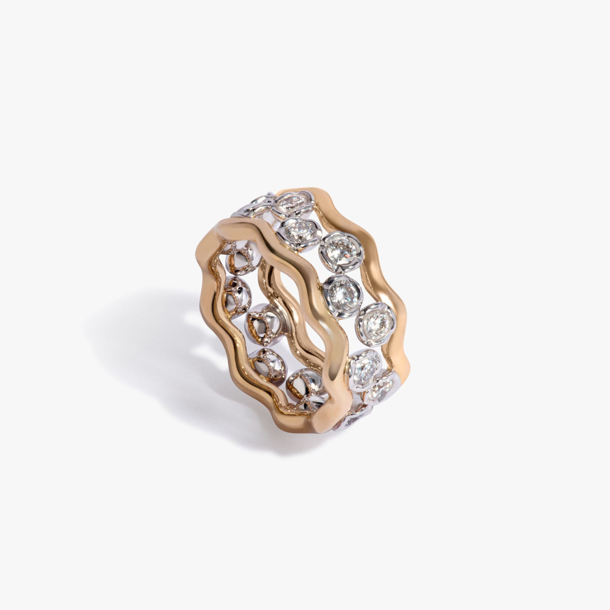 Handcrafted in bi-colour 18k gold with white diamonds in organic cup settings. Comprises two interlocking eternity rings.
