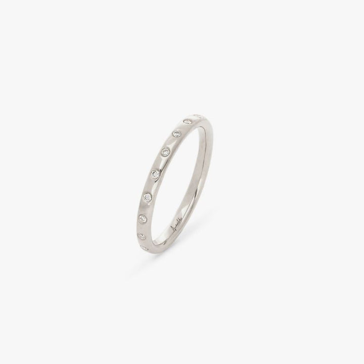 This 2mm Diamond Wedding Ring by Annoushka is a sleek and gender-inclusive symbol of commitment, handcrafted with the utmost precision. Cast in 100% recycled 18k white gold and set with 20 diamonds, its polished band balances classic tradition with modern ethos. Designed to harmonize with the Crown and Marguerite collections, it offers timeless elegance for everyday wear.